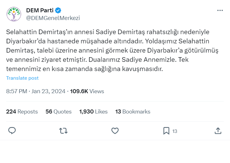 پارتی یەکسانیی و دیموکراسیی گەلان ئێوارەی ئەمڕۆ سێشەممە لە ڕاگەیەندراوێکدا لە تۆڕی کۆمەڵایەتی ئێکس بڵاویکردەوە، "دایکی سەڵاحەدین دەمیرتاش بەناوی سەدیە دەمیرتاش بەهۆی نەخۆشییەوە لە نەخۆشخانەی دیاربەکر لەژێر چاودێریدایە، هەڤاڵمان سەڵاحەدین دەمیرتاش لەسەر داوای دایکی برایە دیاربەکر و سەردانی دایکی کرد، دوعاکانمان لای دایکمان سدیهیە، ئاواتمان ئەوەیە کە بە زوترین کات چاكببێتهوه".
