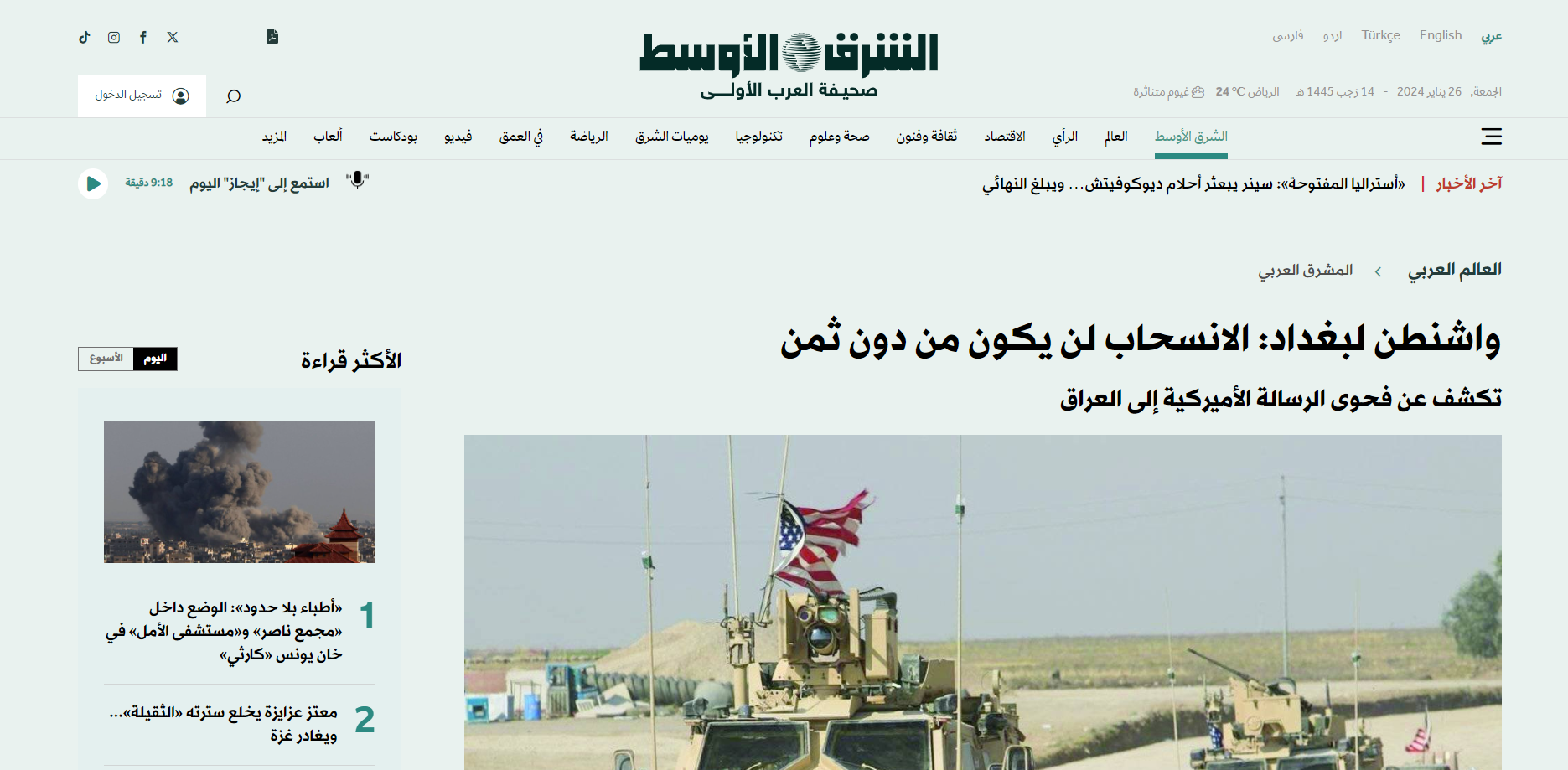 رۆژنامهی شهرق ئهلئهوسهت، ناوهڕۆكی پهیامێكی واشنتنی بۆ بهرپرسانی عێراقی بڵاوكردوهتهوه، كه تیایدا "شێوازی کشانەوەی هێزهكانی هاوپهیمانان له عێراق و خشتەی کاتی لەخۆگرتوه" بهڵام جهختیكردوهتهوه كه "كشانهوهكه، ئەگەر روبدات، بێ باج نابێت".