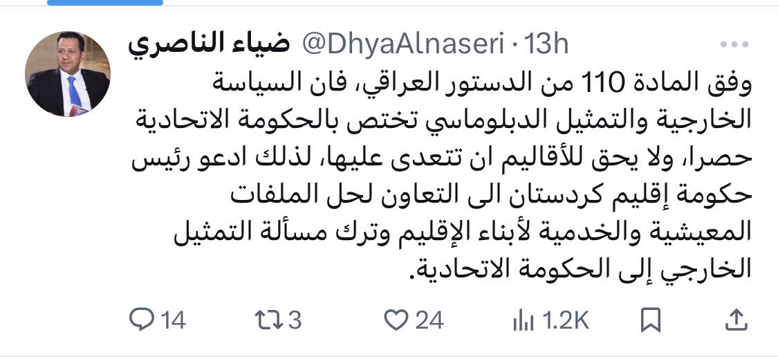 زیا ناسڕى، راوێژکارى محەمەد شیاع سودانى، سەرۆک وەزیرانى عێراق لە بڵاوکراوەیەکیدا لە تۆڕى کۆمەڵایەتیی ئێکس نوسیویەتى:" بەپێى ماددەى 110 لە دەستورى عێراق، سیاسەتى دەرەوە و نوێنەرایەتییە دیپلۆماسییەکان تایبەتن بە حکومەتى عێراق و هەرێمى کوردستان مافى دەستوەردانى نییە.