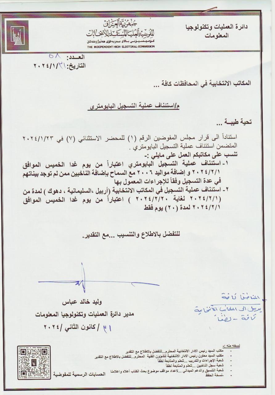 کۆمسیۆنی باڵای سەربەخۆی ھەڵبژاردنەکانی عیراق/ئۆفیسی ھەڵبژاردنەکانی سلێمانی بۆ ماوەی ٢٠ رۆژ پرۆسەی تۆماری بایۆمەتری دەستپێدەکات.