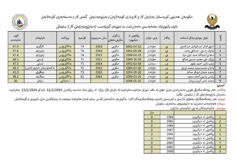 ئەمڕۆ شەممە ١٠ی شوباتی ٢٠٢٣بەڕێوەبەرایەتی کار و کاروباری کۆمەڵایەتی حکومەتی هەرێمی کوردستان لە ڕاگەیەنراوێکدا ناوی پاڵێوراوانی بڵاوکردەوە بە مەبەستی دامەزراندنیان بە شێوەی گرێبەست لە بەڕێوەبەرایەتی کار- سلێمانی.