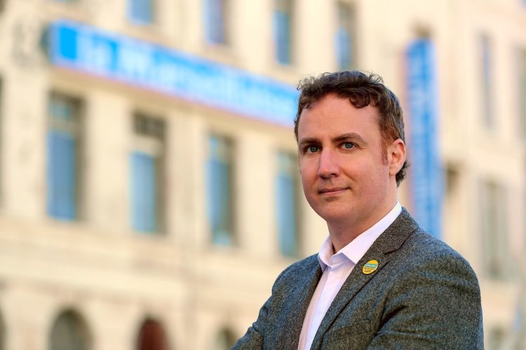 "لیۆ پۆرگیت" سهرنوسهرى ڕۆژنامهکه بهشداریى خۆپیشاندانهکهى کردو ملپێچێکى گهریلاى پۆشى بوو، ئاڵایهکى کهجهکهى بهدهستهوه بوو.