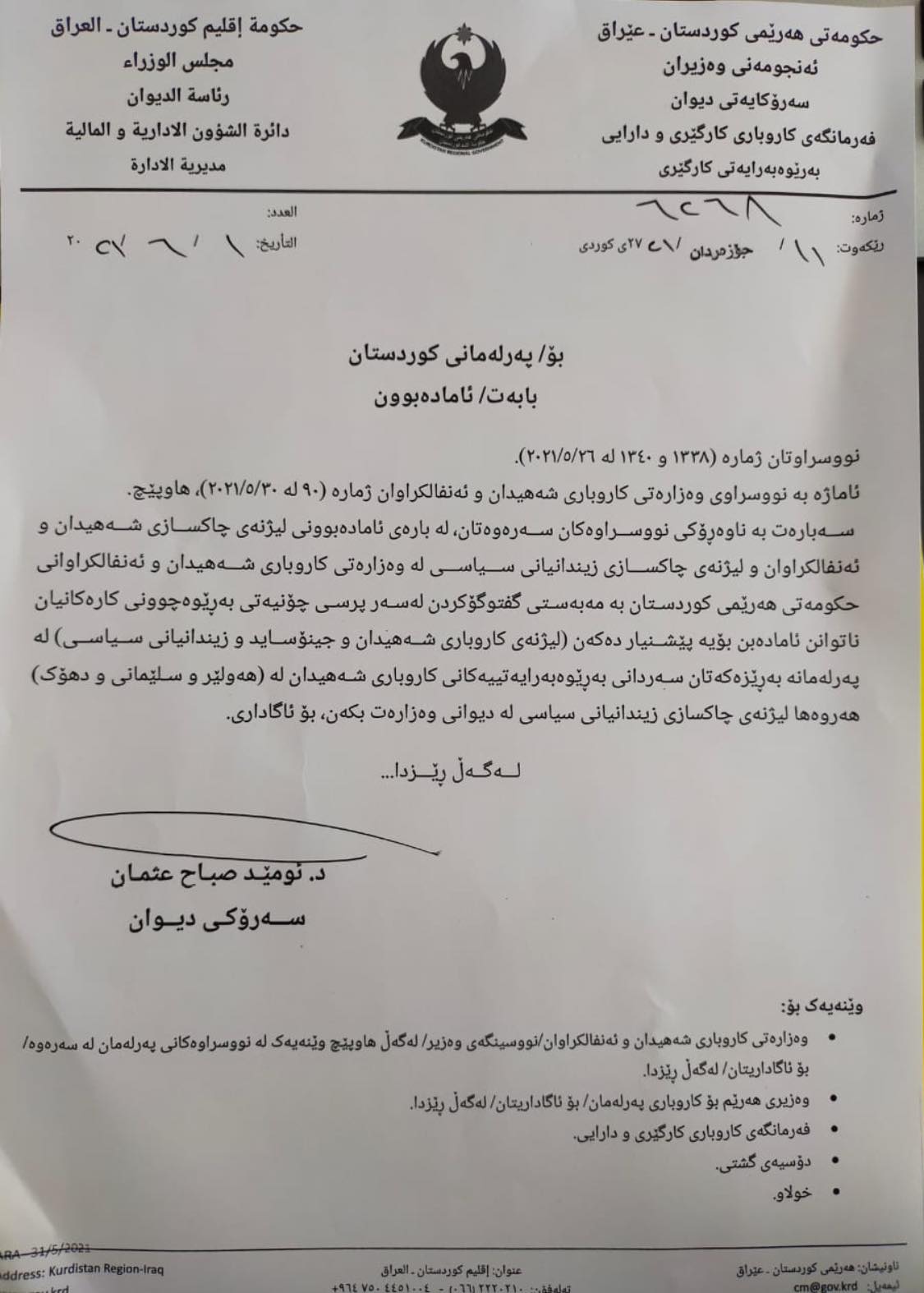 حكومەتی هەرێمی كوردستان لەنوسراوێكی رەسمیدا كە ئیمزای ئومێد سەباح، سەرۆكی دیوانی ئەنجومەنی وەزیرانی لەسەرە، وەڵامی داواكەی پەرلەمانی كوردستانی داوەتەوەو وتویەتی، لیژنەكانی وەزارەتی كاروباری شەهیدان و ئەنفالكراوان "ناتوانن ئامادەبن، بۆیە پێشنیار دەكەن (لیژنەی كاروباری شەهیدان و جینۆسایدو زیندانیانی سیاسی) لە پەرلەمانە بەڕێزەكەتا سەردانی بەڕێوەبەرایەتییەكانی كاروباری شەهیدان لە هەولێرو سلێمانی و دهۆك و هەروەها لیژنەی چاكسازی زیندانیانی سیاسی لە دیوانی وەزارەت بكەن."