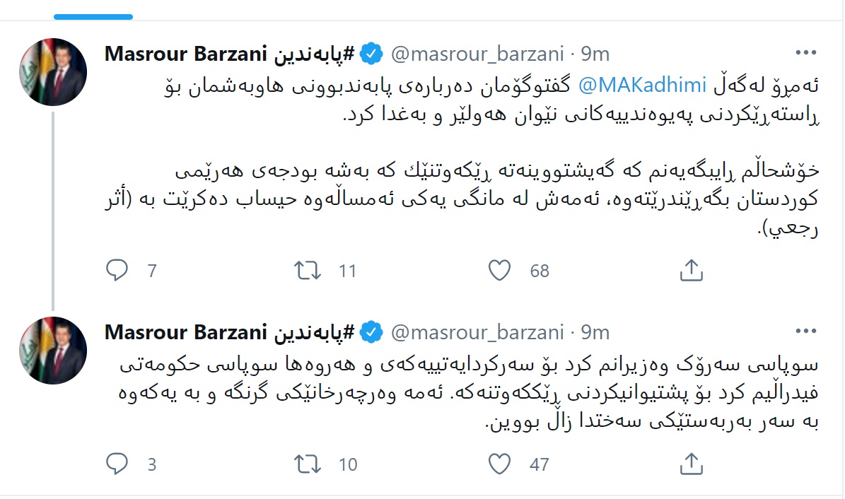 سهرۆکى حکومهتى ههرێمى کوردستان پهیوهندییهکى تهلهفۆنى لهگهڵ مستهفا کازمى سهرۆک وهزیرانى عێراق ئهنجامدا و سوپاسى حکومهتهکهى کرد که "رهزامهندى نیشانداوه لهسهر جێبهجێکردنى رێککهوتنى نێوان ههرێم و بهغدا وئاشکراشیکرد که رێککهوتون لهسهر ئهوهى حکومهتى عێراق بهشه بودجهى ههرێم لهمانگى یهکى ئهمساڵهوه بگێڕێتهوه".