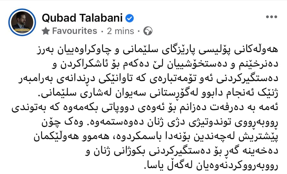 ئهمڕۆ چوارشهممه 16ى حوزهیرانى 2021، قوباد تاڵهبانى جێگرى سهرۆکى حکومهتى ههرێم، له ههژمارى تایبهتى خۆى لهتۆڕى کۆمهڵایهتى فهیسبوک نوسیویهتی: "ههوڵهکانى پۆلیسى پارێزگاى سلێمانى و چاوکراوهییان بهرز دهنرخێنم و دهستخۆشییان لێ دهکهم بۆ ئاشکراکردن و دهستگیرکردنى ئهو تۆمهتبارهى که تاوانێکى دڕندانهى بهرامبهر ژنێک ئهنجامدابو لهگۆڕستانى سهیوان لهشارى سلێمانی".