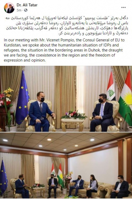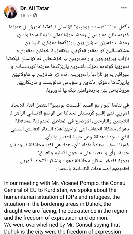 له نوسینهکهیدا که له لاپهڕهى خۆى بڵاویکردبوهوه، عهلى تهتهر، پارێزگارى دهۆک لهبارهى دیدارێکى لهگهڵ ڤانسینت پۆمپیۆ، کونسوڵى یهکێتى ئهوروپا له ههرێمى کوردستان، رایگهیاندبو، کونسوڵى یهکێتییهکه پێى وتین: "دهۆک باشترین پارێزگاى ههرێم و عێراقه بۆ ئازادى رادهبرین."
