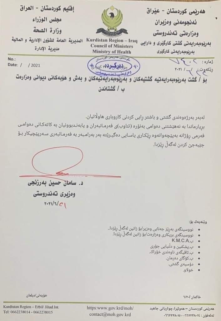 وهزارهتى تهندروستى حکومهتى ههرێمى کوردستان بڕیارێکى لهبارهى دهوامى فهرمانبهرانى وهزارهتهکهى دهرکرد و بڕیاریدا دهوامى (تهناوب)بهنۆره نههێڵێت.