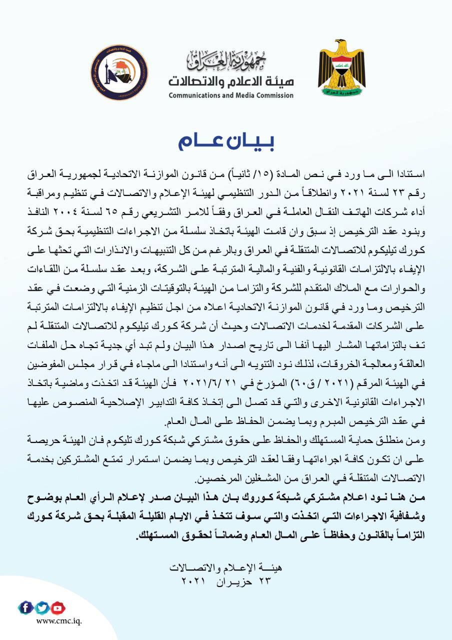 دهستهى راگهیاندن و پهیوهندییهکانى عێراق له نوسراوێکدا رایگهیاندوه، دواى ئهو ههموو ئاگادارکردنهوانهى پێیانداوه، کۆمپانیاى (کۆڕهک تیلیکۆم) پابهند نهبووه بهو بابهته یاسایى و هونهریى و داراییانهى که دهکهوێته سهرشانی.