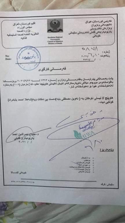لهنوسراوهکهدا که واژۆى بهرێوهبهرى گشتى تهندروستى سلێمانى لهسهره تێیدا هاتووه:" پشت بهدهسهڵاتى پێدراومان بهفهرمانى وزارى ژماره 1392 له 22ى 2ى 2021 بڕیارماندا بهگواستنهوهى موچهو میلاکى ئهو پهرستارانهى ناویان لهلیستى هاوپێچدا هاتوه که ژمارهیان 108 پهرستاره لهنهخۆشخانهى هیوا بۆ نهخۆشخانهى شارو لیستى ناوهکان به(ئهوین مستهفا بابه) دهستپێدهکاتو به(شههلا ئهحمهد بابه مراد) کۆتایى دێت".
