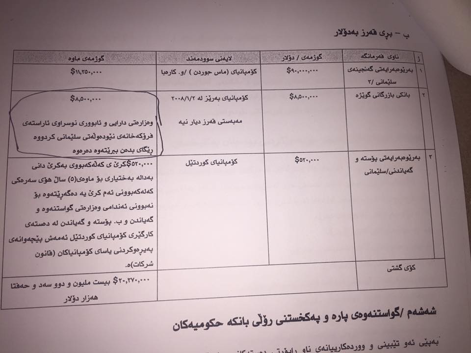 ئهندامێكى پهرلهمانى كوردستان نوسراوێكى دیوانى چاودێریى دارایی ههرێم ئاشكرادهكات لهبارهى پێدانى قهرز بهكۆمپانیایهكى ناوخۆیی ههرێمو دواتریش بردنه دهرهوهى كۆى پارهكه، ڕاشیدهدگهیهنێت، "لهلایهن ئهو كۆمپانیایهوه سكاڵام لهسهر تۆماركراوهو داواى 300 ملیۆن دینار قهرهبوم لێكراوه"، دهشڵێت:"ئیمانو باوەڕی خۆم بەھەموو سەروەتی پارتیو یەکێتیو کۆمپانیاکانیان نادەمو بهردهوام دهبم".