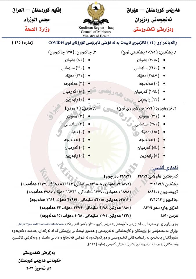 بهپێى راگهیهندراوهکه لهماوهى 24 سهعاتى رابردودا 10 ههزارو 475 پشکنینى نوێ ئهنجامدراون و ههزارو 71 توشبوى نوێى کۆرۆنا تۆمارکراون و 625 توشبوش چاکبونهتهوه و شهش کهسی دیکه گیانیان لهدهستداوه.