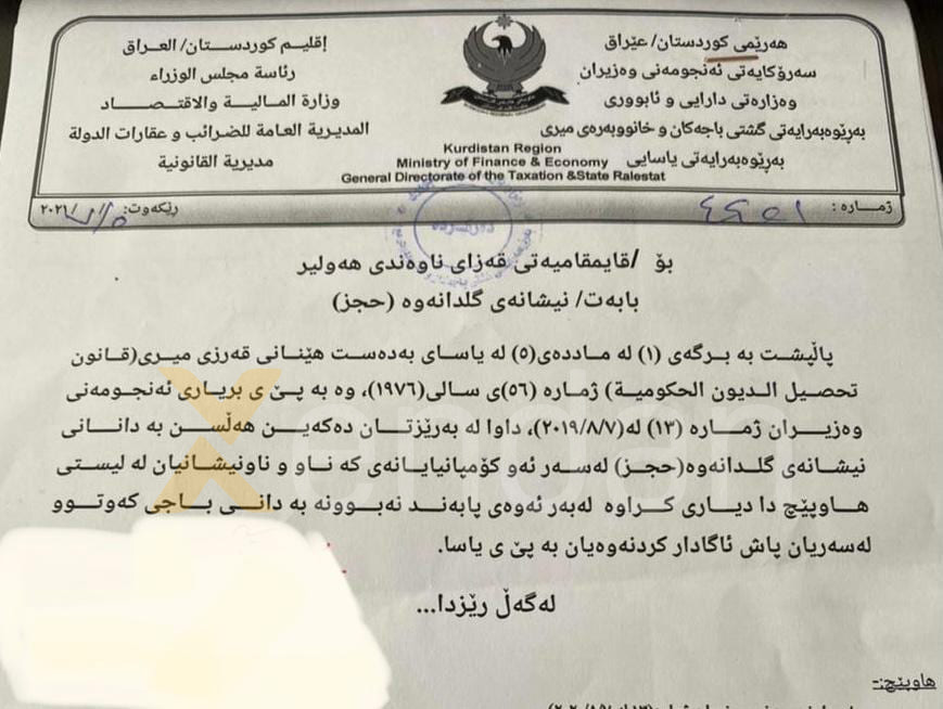 لە نوسراوێكدا بەڕێوبەرایەتی گشتی باجەكان و خانوبەرەی میری سەر بە وەزارەتی دارایی و ئابوری کە ئاڕاستەی قائیمقامیەتی قەزای ناوەندی هەولێر كراوە تیایدا هاتوە، "بە پشت بەستن بە بڕیاری ئەنجومەنی وەزیران ژمارەی (13)ی 7/8/2019 داوا لە بەرێزیان دەكەن كە بەهۆی پابەند نەبونیان بە دانی باج، نیشانەی گلدانەوە بخەنە سەر چەند كۆمپانیایەكی بواری نەوت".