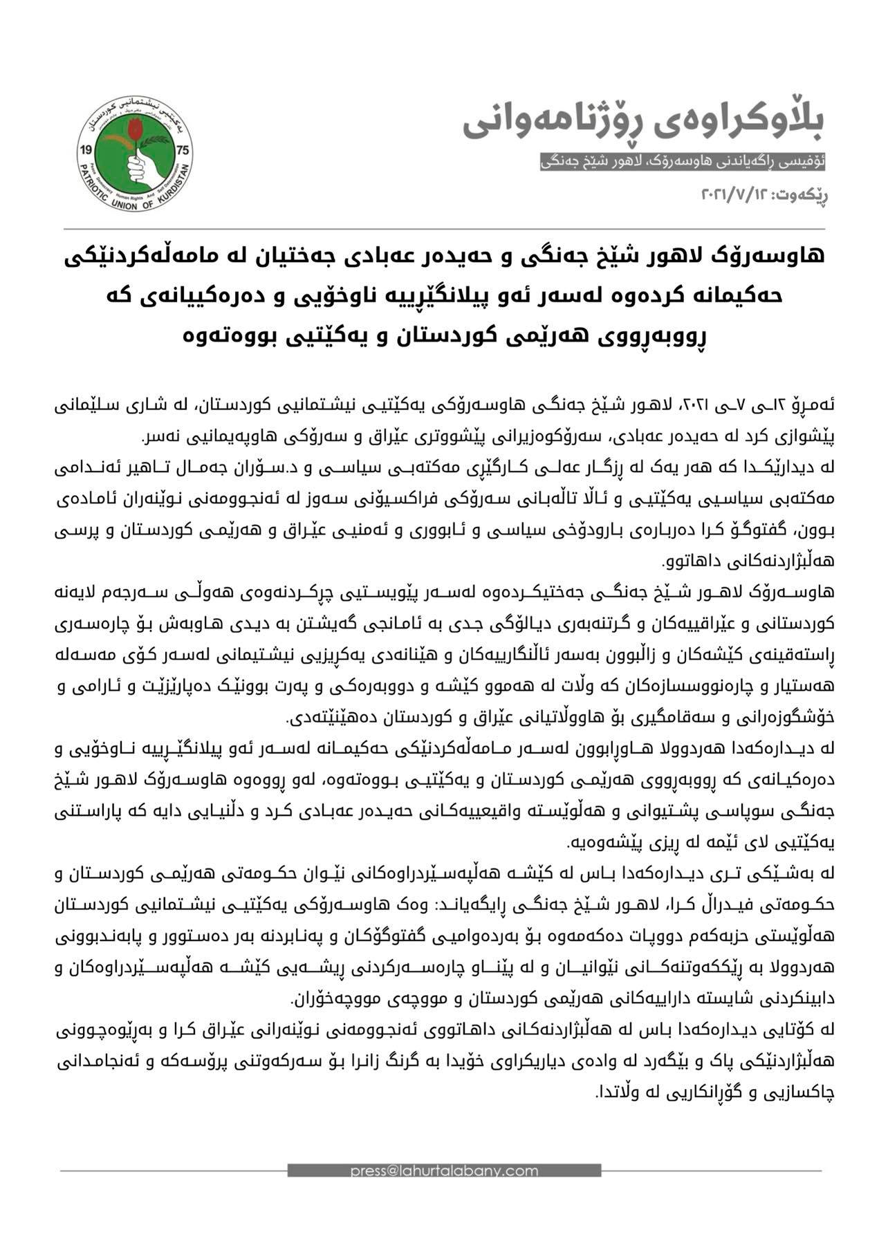 لاهور شێخ جهنگى، هاوسهرۆکى یهکێتى ڕایگهیاند"پێویسته مامهڵهکردنێکى حهکیمانه ههبێت لهسهر ئهو پیلانگێڕییه ناوخۆییو دهرهکیانهى که ڕوبهڕوى ههرێمى کوردستانو یهکێتیى بووهتهوه".