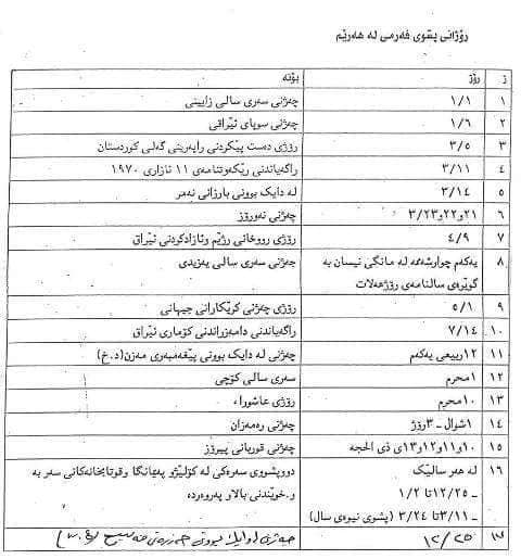خشتەی رۆژەکانی پشوو لە هەرێمی کوردستان:-