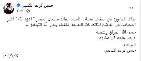 حەسەن کەعبی، جێگری سەرۆکی پەرلەمانی عێراق لەپەڕەی فەرمی خۆی لەفەیسبوک باسی لەوەکردوە، دوای وتارەکەی موقتەدا سەدر، رێبەری رەوتەکەیان بڕیاریداوە لەخۆکاندیدکردن و بەشداریکردن لەهەڵبژاردنی پێشوەخت بکشێتەوە.