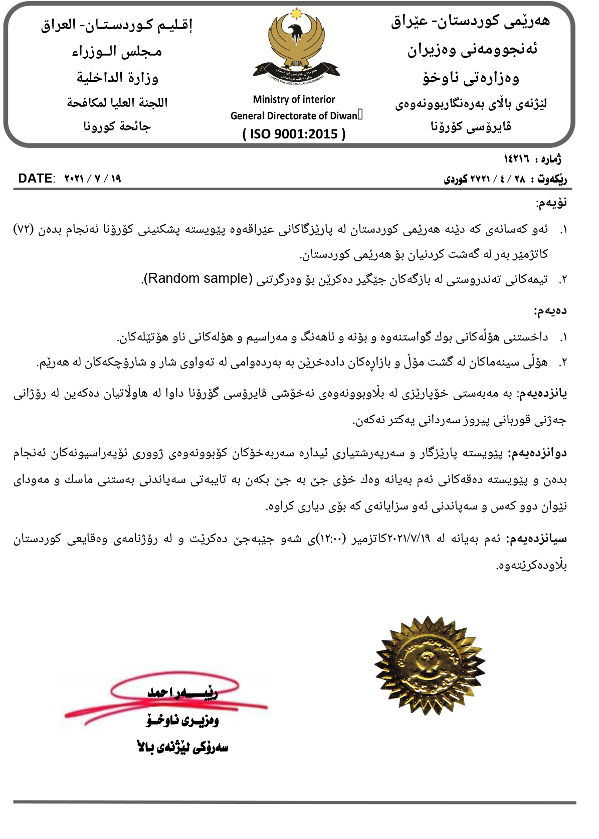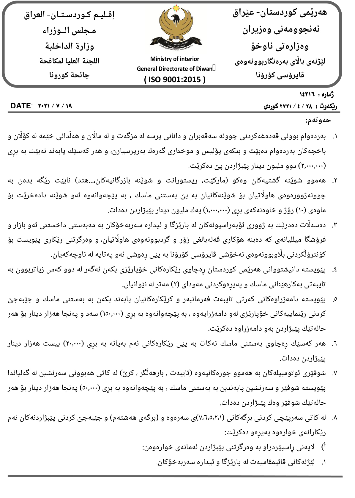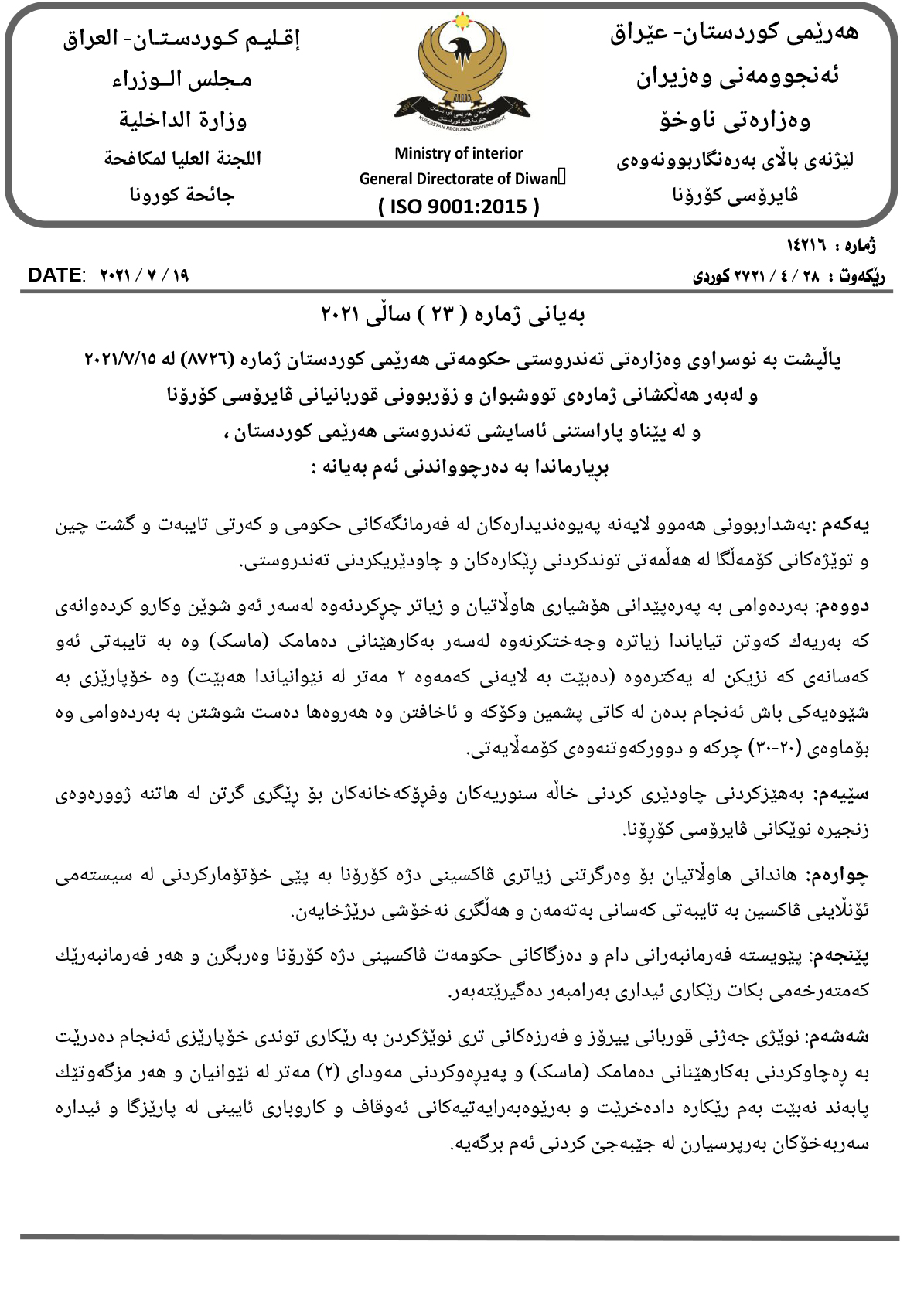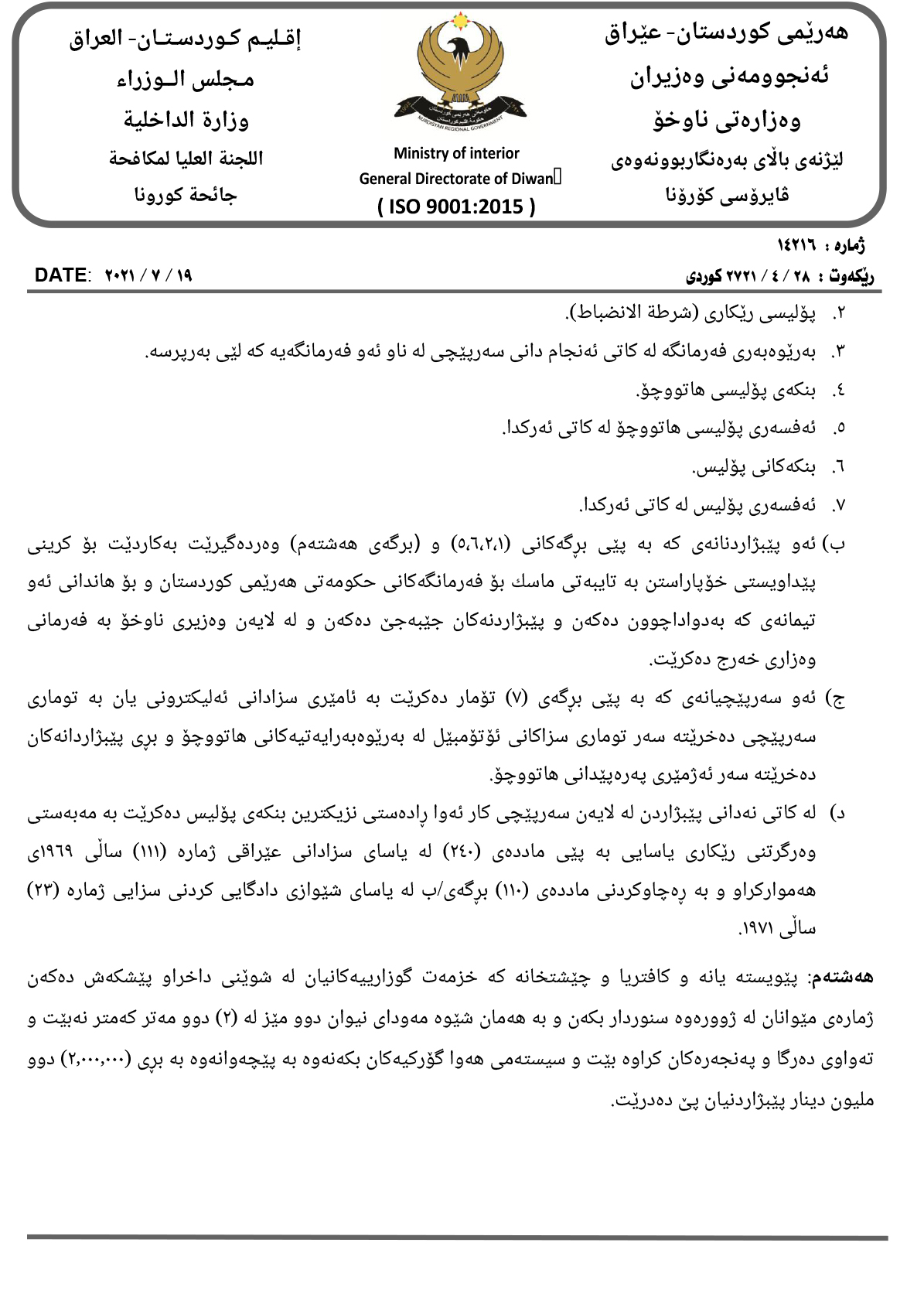 بڕیارەکانی وەزارەتی ناوخۆ لە ئەمڕۆ دووشەممە 19ی تەمموزی 2021. جێبەجێدەکرێن.