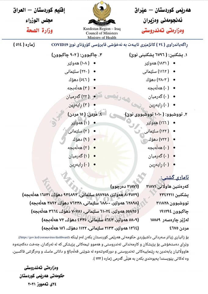 وهزارهتى تهندروستى حکومهتى ههرێمى کوردستان رایگهیاند، لهماوهى 24 کاتژمێرى رابردوودا شهش ههزارو 796 پشکنینى کۆرۆنا کراون، لهنێویاندا ههزارو 10 توشبوى نوێى کۆرۆنا تۆمارکراون و 902 توشبو چاکبونهوه، 15 توشبوو گیانیان لهدهستداوه.