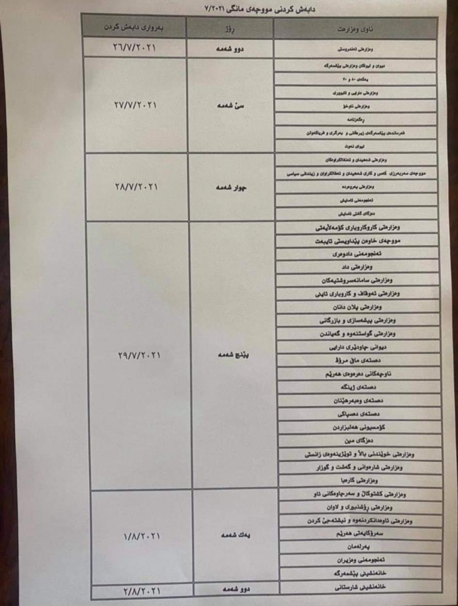بهپێی خشتهی وهزارهتی دارایی كه پێشتر بڵاویكردووهتهوه، تیایدا هاتووه ئهمڕۆ پێنجشهممه 29ی تهمموزی 2021، مووچهی وهزارهتی كاروباری كۆمهڵایهتی، خاوهن پێداویستی تایبهت، ئهنجومهنی دادوهری، وهزارهتی داد، وهزارهتی سامانه سرووشتییهكان، وهزارهتی ئهوقاف و كاروباری ئاینی، وهزارهتی پلاندانان، وهزارهتی پیشهسازی و بازرگانی، وهزارهتی گواستنهوه و گهیاندن، وهزارهتی خوێندنی باڵاو توێژینهوهی زانستی، وهزارهتی شارهوانی و گهشتوگوزار و وهزارهتی كارهبا، دیوانی چاودێری دارایی، دهستهی مافی مرۆڤ، ناوچهكانی دهرهوهی ههرێم، دهستهی ژینگه، دهستهی وهبهرهێنان، دهستهی دهستپاكی، كۆمسیۆنی ههڵبژاردن و دهزگای مین دابهشدهكرێت.