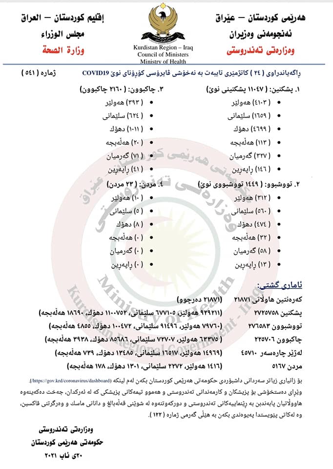 ئەوەش هاتوە، لەو ماوەیەدا 2160 توشبو چاکبونەتەوە و 23 توشبوی پەتاکەش مردون کە بەگوێرەی پارێزگاکان بەم شێوەیە بون هەولێر 10 کەس، سلێمانی 5 کەس و لە دهۆکیش 8 توشبو مردوە.