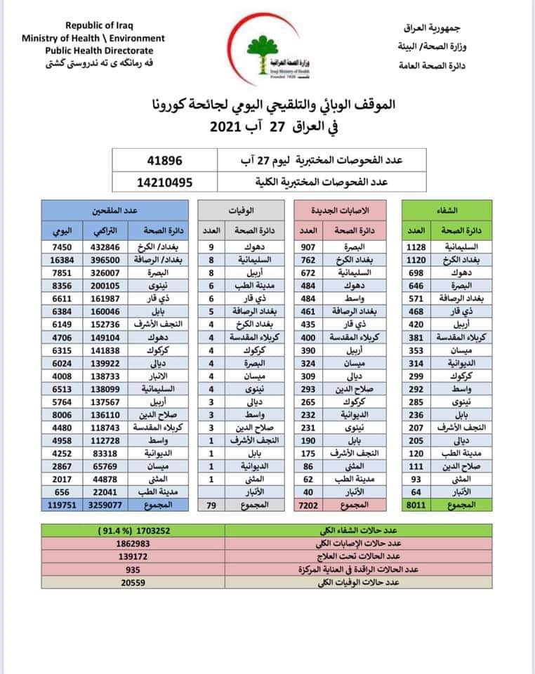وهزارهتی تهندروستی و ژینگهی عێراق رایگهیاند:" له 24 كاتژمێری رابردوودا 79 توشبوی كۆرۆنا گیانیان لەدەستداوە، حەوت هەزار و 202 توشبوی دیكه تۆماركراون، زۆرترین حاڵەتی گیان لەدەستدانیش لەپارێزگاکانی هەرێم لەدهۆک تۆمارکراوە کە تێیدا 9 کەس گیانیان لەدەستداوە.
