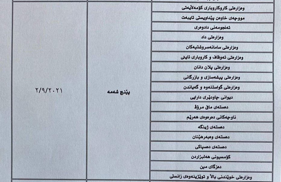 ئەمڕۆ چوارشەممە 1ی ئهیلوولی 2021، وەزارەتی دارایی و ئابوری حکومەتی هەرێمی کوردستان رایگەیاند:" سبەینێ پێنجشەممە موچەی مانگی ئابی "وەزارەتی کاروباری کۆمەڵایەتی، خاوەن پێداویستی تایبەت، ئەنجومەنی دادوەری، وەزارەتی داد، وەزارەتی سامانە سروشتییەکان، وەزارەتی ئەوقاف و کاروباری ئایینی، وەزارەتی پلادانان، وەزارەتی پیشەسازی و بازرگانی، وەزارەتی گواستنەوە و گەیاندن، دیوانی چاودێری دارایی، دەستەی مافی مرۆڤ، ناوچەکانی دەرەوەی هەرێم، دەستەی ژینگە، دەستەی وەبەرهێنان، دەستەی دەستپاکی، کۆمسیۆنی هەڵبژاردن، دەزگای مین، وەزارەتی خوێندنی باڵا"، بەبێ لێبڕین دابەش دەكرێت.
