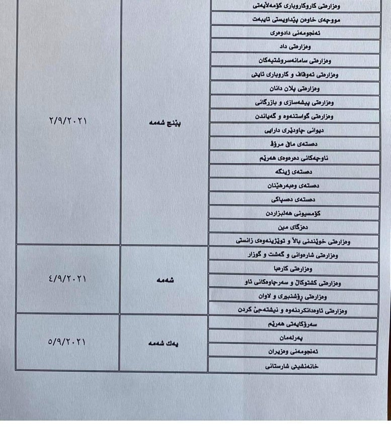 بهپێی خشتهی وهزارهتی دارایی و ئابووری سبەی شەممە دابەشکردنی موچەی مانگی ئابی ئەمساڵ بەبێ لێبڕین بەردەوام دەبێت و موچەی ئەم شوێنانە دابەشدەکرێت: وەزارەتی شارەوانی و گەشتوگوزار، وەزارەتی كارەبا، وەزارەتی كشتوكاڵ و سەرچاوەكانی ئاو، وەزارەتی ڕۆشنبیری و لاوان و وەزارەتی ئاوەدانكردنەوەو نیشتەجێكردن.