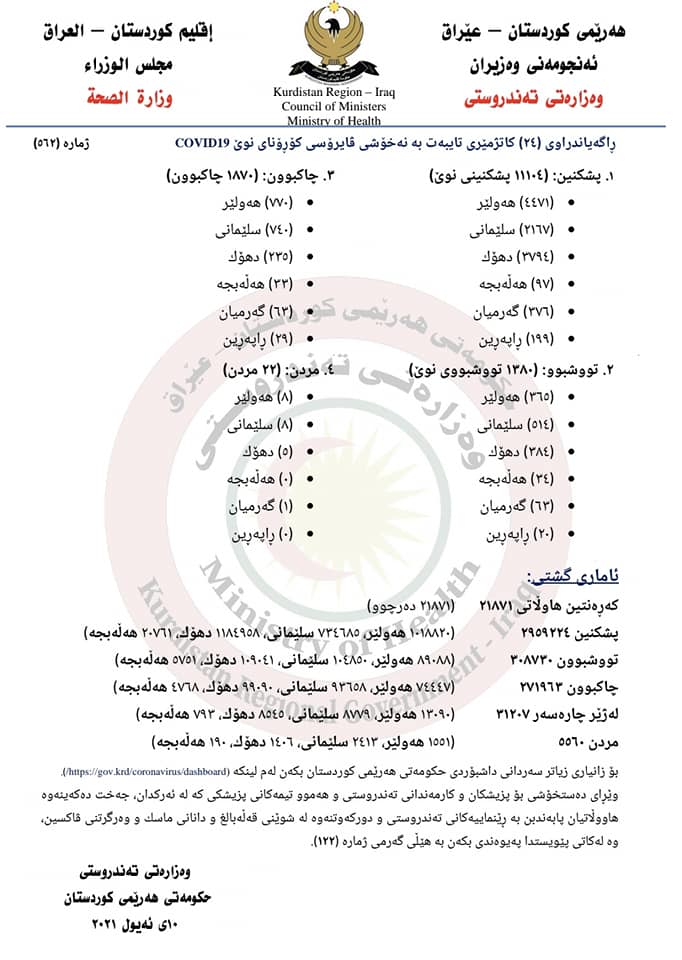 تەندروستی هەرێم ئاماری ئەمڕۆی کۆرۆنای بڵاوکردەوە