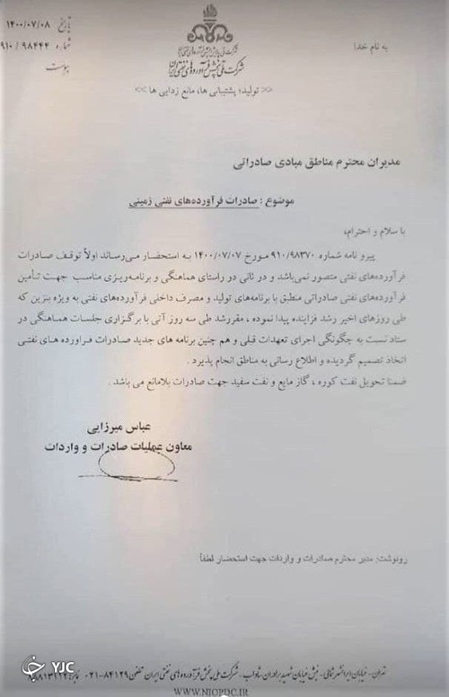 ئەمڕۆ پێنجشهممه 7ی تشرینی یهكهمی 2021، وەزارەتی نەوتی ئێران لە نوسراوێكدا كە ئاڕاستەی بەڕێوەبەرایەتی هەناردەكردنی بەرهەمە نەوتییەكانی وڵاتەكەی كردوە و نوسراوەكە لە بەشێك لە میدیاكانی ئەو وڵاتە بڵاوكراوەتەوە تیایداهاتووە، لە ماوەیەكی نزیكدا ناردنی بەنزین و گازو بەرهەمە نەوتییەكان بۆ دەرەوەی وڵات رابگرێت.