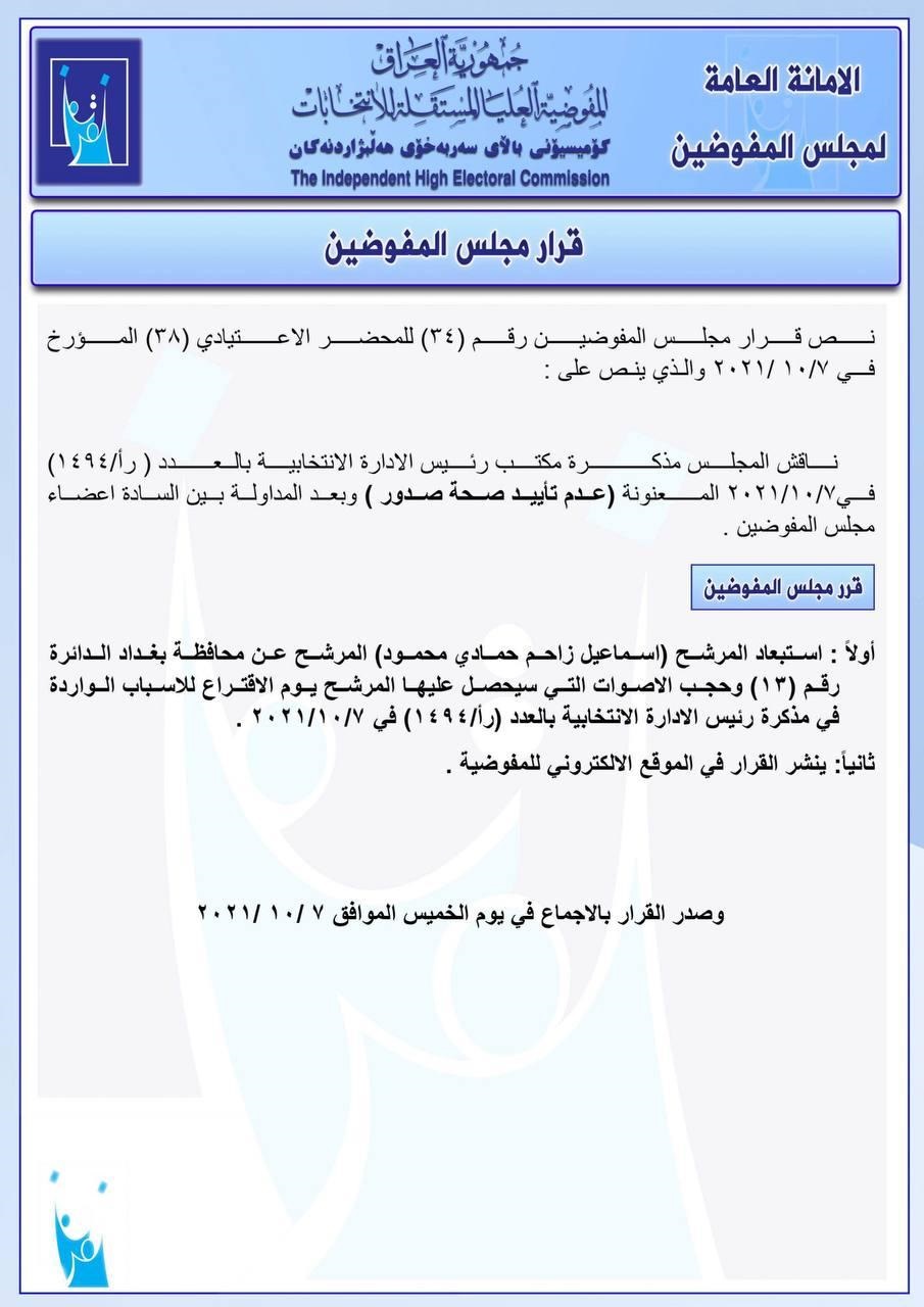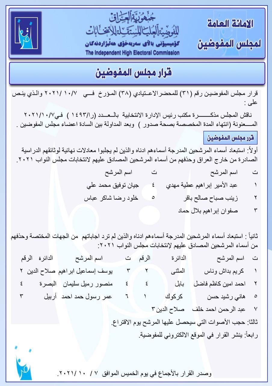 به بڕیاری كۆمسیۆنی باڵای سهربهخۆی ههڵبژاردنهكانی عێراق ژمارهیهك كاندید له پرۆسهی ههڵبژاردن دورخرانهوه و ئهو دهنگانهشیان سڕ دهكرێت كه له دهنگدانی تایبهت هێناویانه.