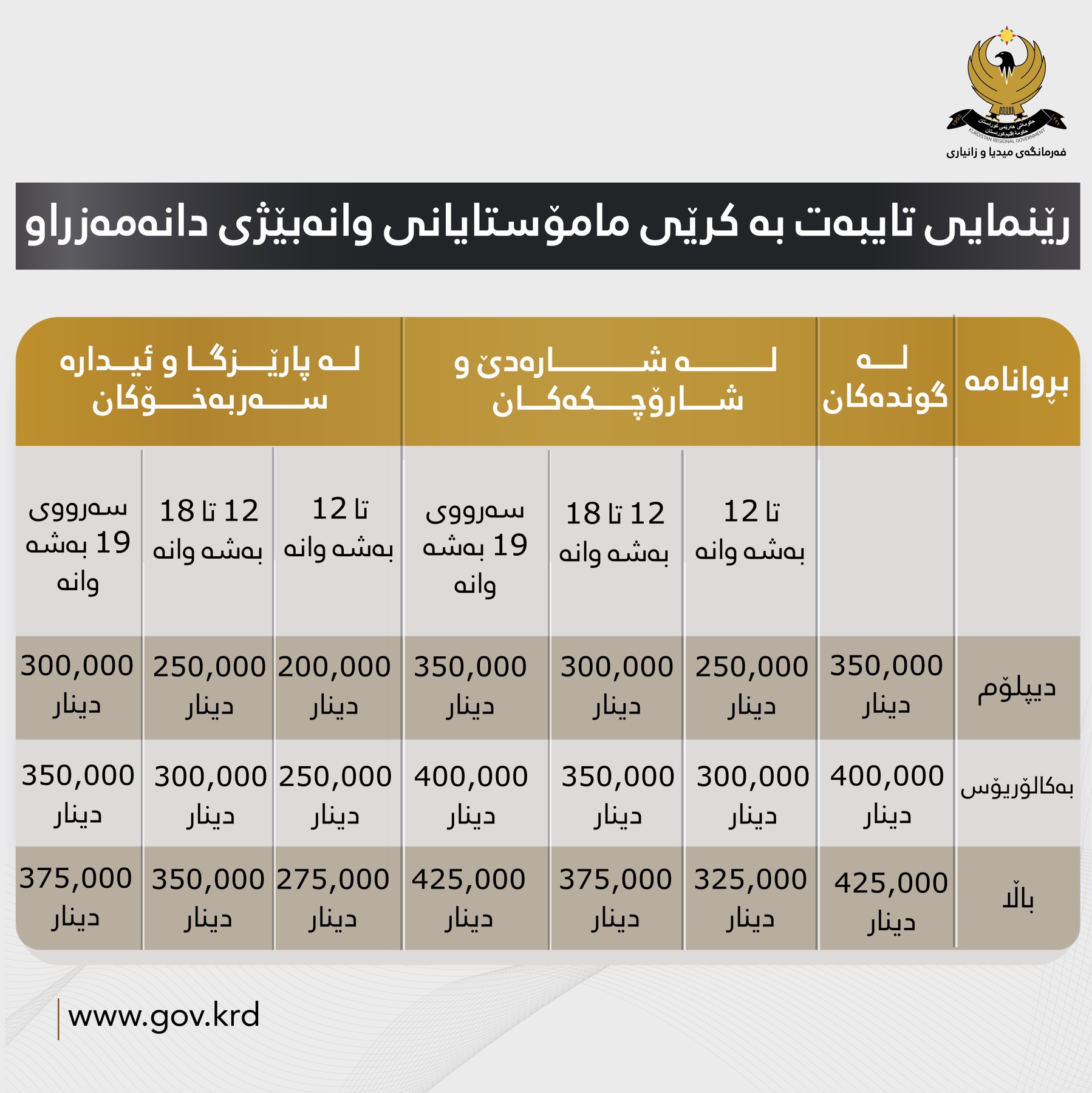 وەزارەتی دارایی و ئابووریی هەرێمی کوردستان رێنمایی نوێی تایبەت بە کرێی مامۆستایانی وانەبێژی دانەمەزراو بڵاوکردەوە و دەڵێت، ئەوانەی دیپلۆمیان هەیە لە گوندەکان 350 هەزار وەردەگرن، بە کالۆریۆس 400 هەزار و باڵاش 425 هەزار وەردەگرن.