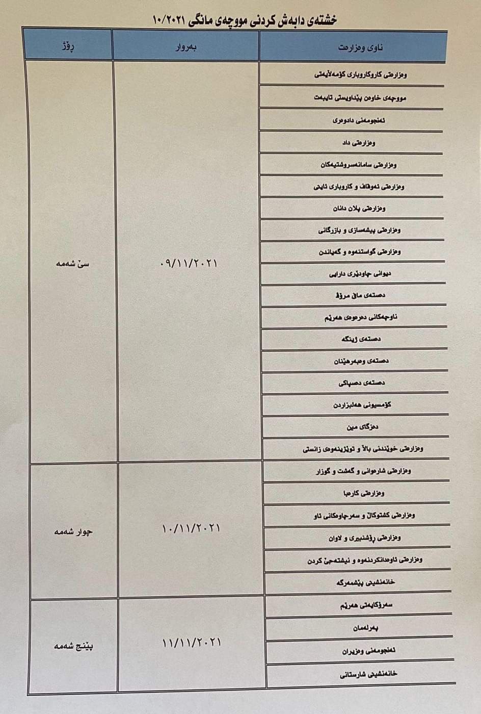 بەپێی خشتەكە سبەینێ سێ شەممە، 9 تشرینی یەكەمی 2021 زۆرترین وەزارەت و دەستە و بەڕێوەبەرایەتی موچە وەردەگرن و پێنج شەممە كۆتا وەزارەت موچە وەردەگرێت.