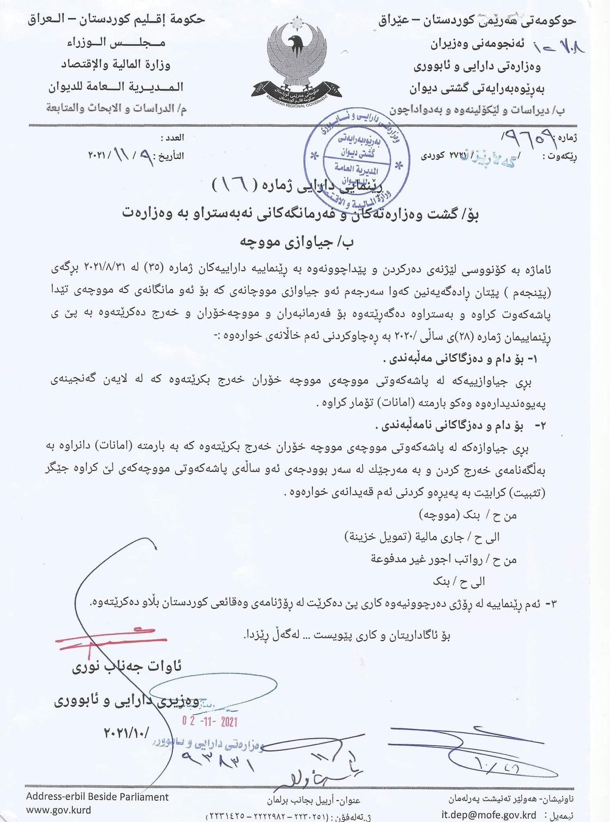 وەزارەتی دارایی و ئابووریی هەرێمی کوردستان رایدەگەیێنێت، بە ئاماژەدان بە رێنماییە داراییەکان ژمارە 35 کە 31-8-2021 بڕگەی پێنجەم، پێتان رادەگەیێنین کە "سەرجەم ئەو جیاوازی مووچانەی کە بۆ ئەو مانگانەی کە مووچەی تێدا پاشەکەوت کراوە و بەستراوە دەگەڕیتەوە بۆ فەرمانبەران و مووچەخۆران و خەرجدەکرێتەوە بەپێی رێنمایی ژمارە 28ی ساڵی 2020 بە رەچاوکردنی ئەم خاڵانە: