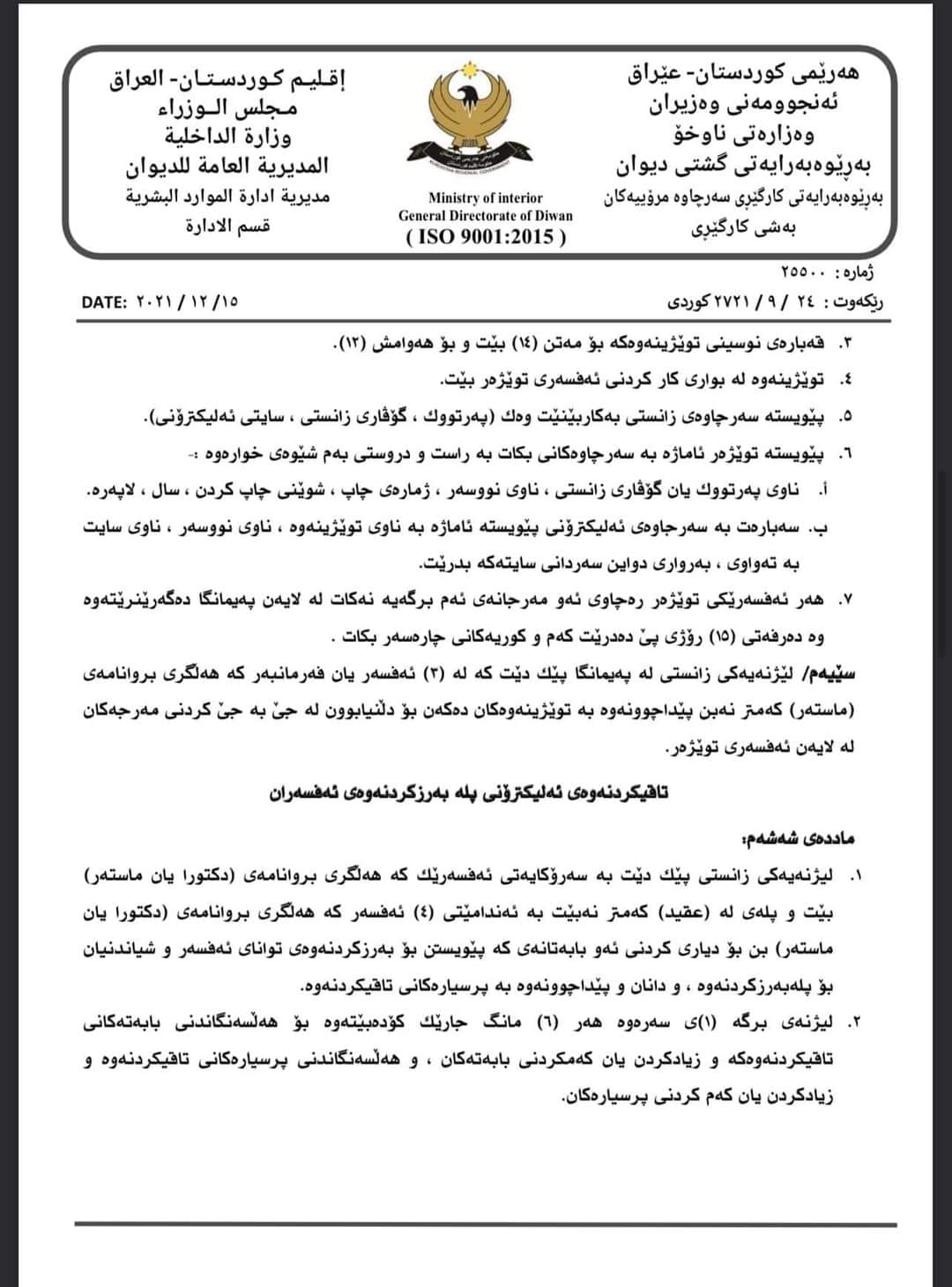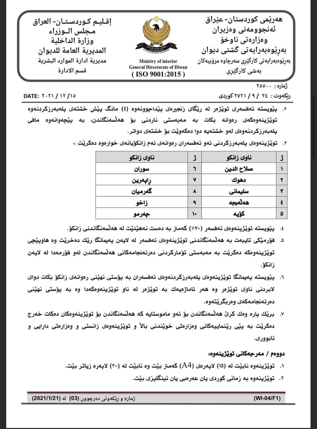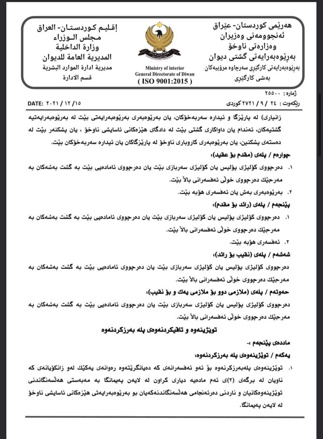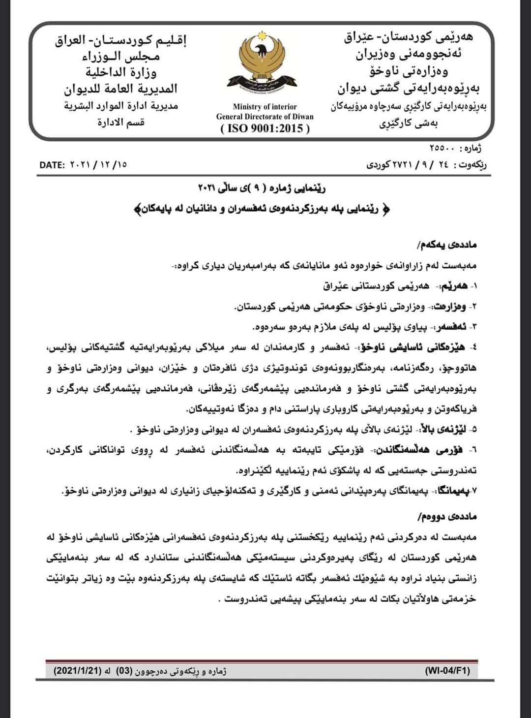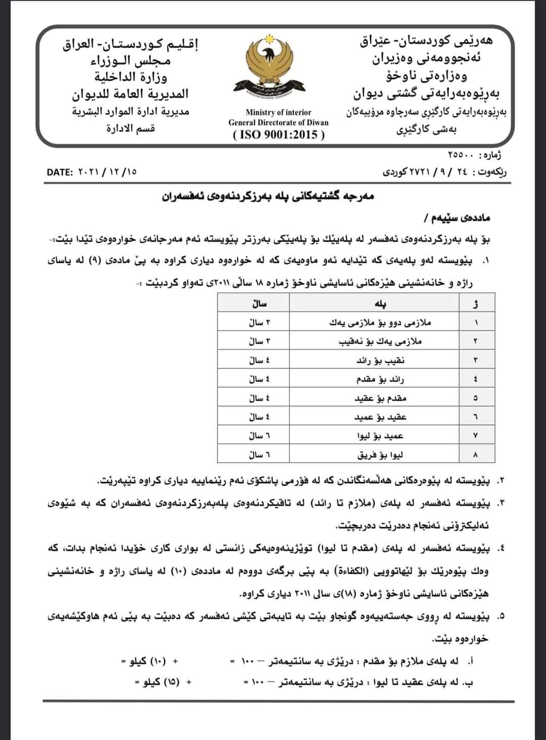 ئەمڕۆ سێشەممە 21ی كانوونی یهكهمی 2021، وهزارهتی ناوخۆی حكومهتی ههرێمی كوردستان رێنماییهكانی پله بهرزكردنهوهی ئهفسهرانی بڵاوكردهوه و بهگوێرهی رێنماییهكانیش، ئهو ئهفسهرهی پلهكهی بهرزدهكرێتهوه مهرجه دهرچوی كۆلێژی پۆلیس بێت یان دهرچوی خولی ئهفسهرانی باڵا بێت.