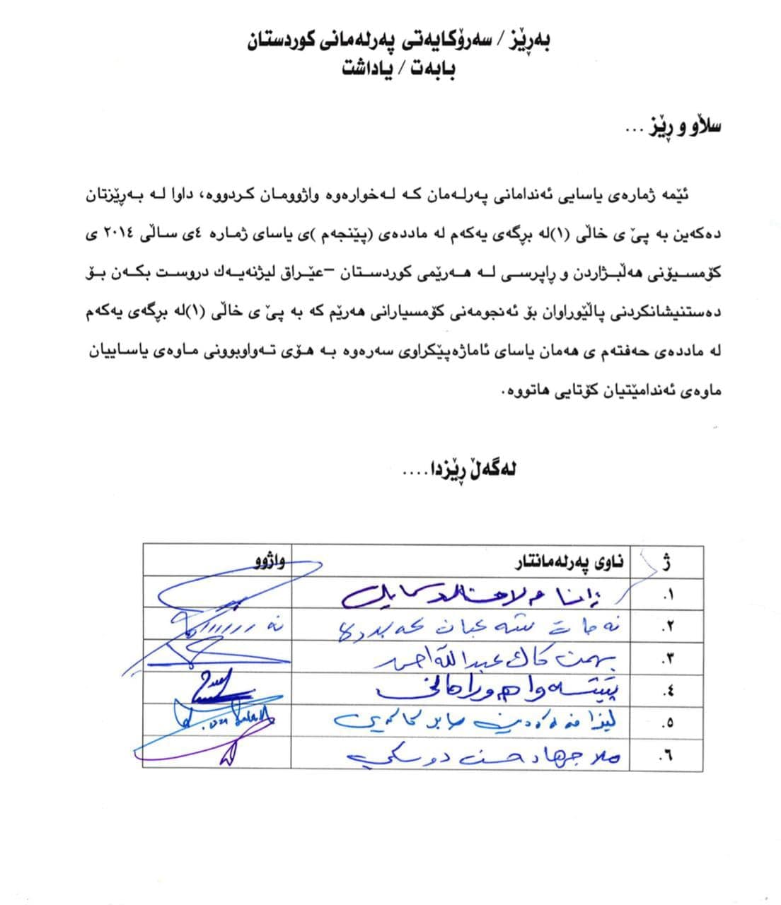 56 ئەندام له 10 فراكسیۆنی پهرلهمانی داوا دەکەن بەزوترین کات لیژنەی پەرلەمانی بۆ دروستکردنەوەی کۆمیسیۆنی هەڵبژاردن و راپرسیی لە هەرێمی کوردستان پێکبھێنرێت.