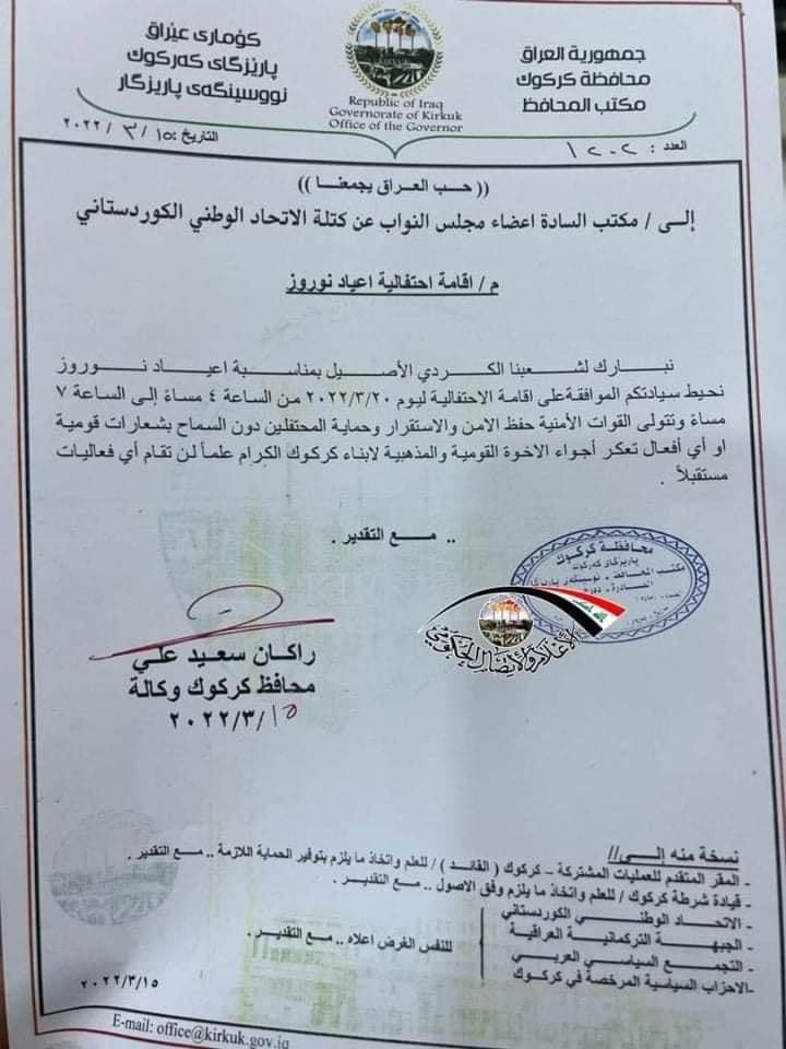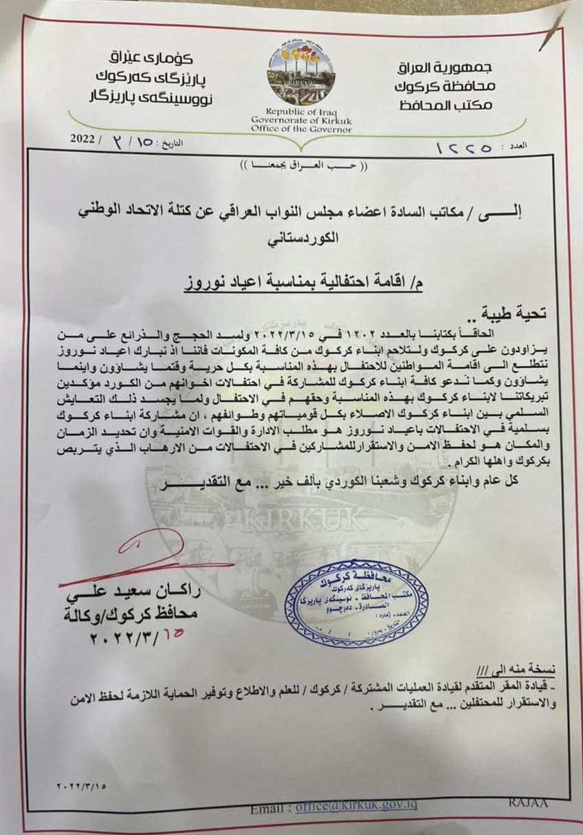 ئەمڕۆ سێشەممە 15ی ئازاری 2021، بەپێی نوسراوێكی پارێزگای كەركوك كە واژۆی راكان جبوری لەسەرە و ئاراستەی نوسینگەی ئەندامانی پەرلەمانی عێراق كراوە لە فراكسیۆنی یەكێتیی هاتوە، پیرۆزبایی لە گەلی كورد دەكەن بەبۆنەی جەژنی نەورۆزەوە و رەزامەندی دەربڕدراوە كە رۆژی 20ی (ئادار/3)ی 2022 لەكاتژمێر 4:00 تا 7:00ی ئێوارە ئەو یادە بكەنەوە.