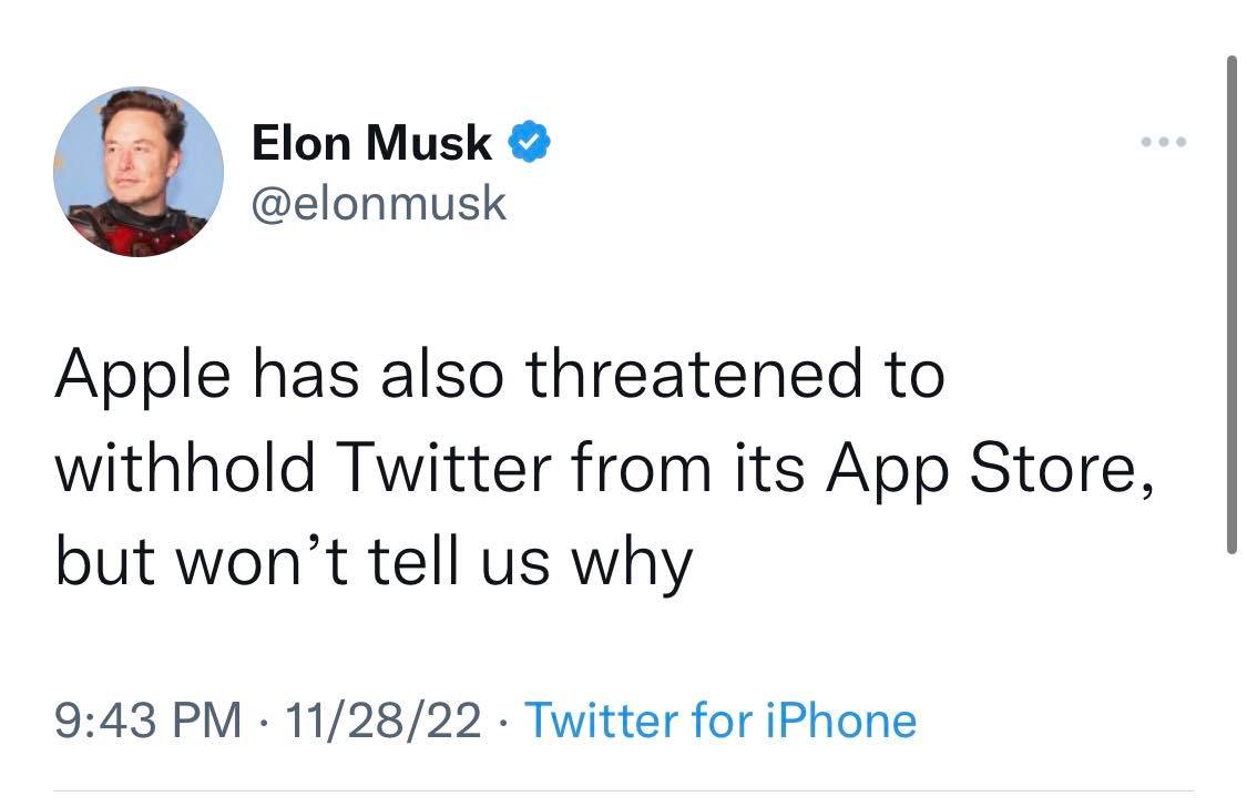 ئیلۆن مەسک، دامەزرێنەری کۆمپانیای تێسلا و سپەیس ئێکس و خاوەنی نوێی کۆمپانیای تویتەر باسی لەوەکرد، کۆمپانیای ئەپڵ هەڕەشەیان لێدەکات بەوەی تۆڕی کۆمەڵایەتی تویتەر لەناو مۆبایلەکانی دەسڕێتەوە.
