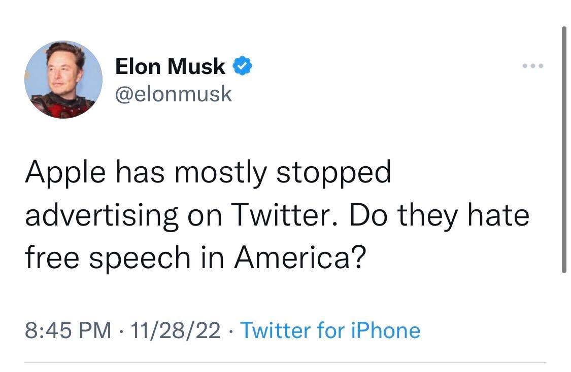 خاوەنی نویێ تویتەرلە تویتێکدا ڕایگەیاند کە کۆمپانیای ئەپڵ زۆرینەی کارە بازرگانی و ڕیکلامەکانی لە تویتەر راگرتووە و ئەو کۆمپانیایەی بەوەستان دژی ئازادی ڕادەربڕین تۆمەتبارکرد.