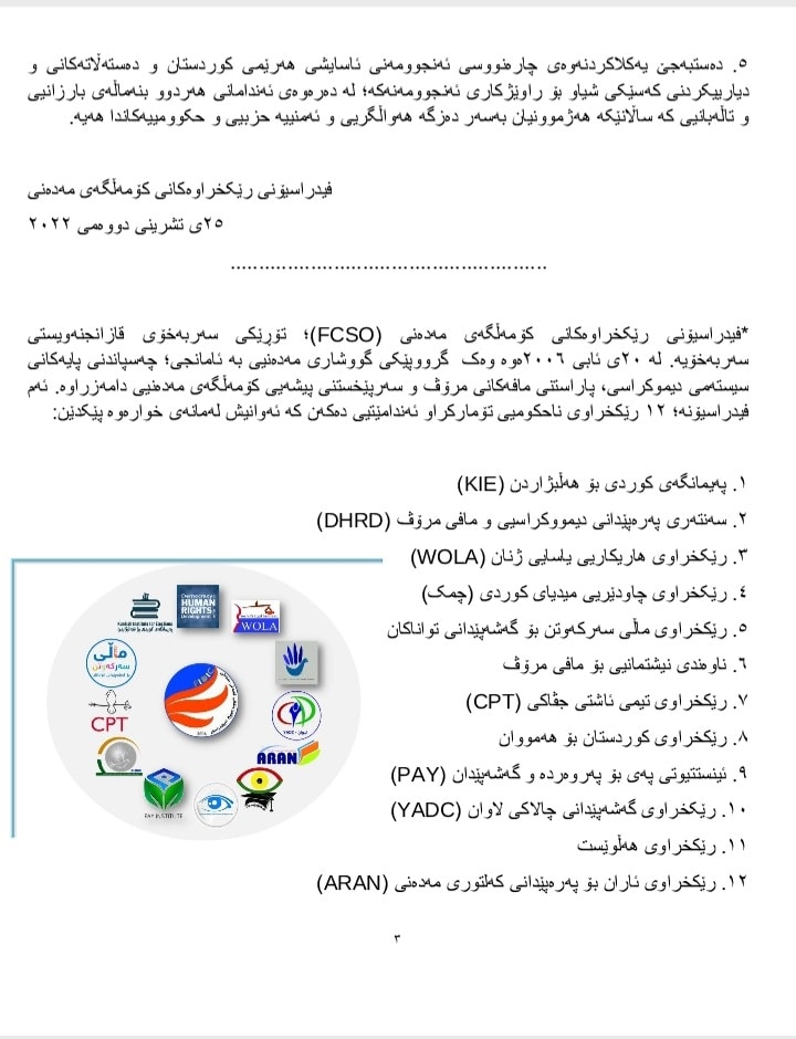 ساڵانێكە فیدراسیۆنی رێکخراوەکانی کۆمەڵگەی مەدەنی (FCSO) بەگشتیی و ھەندێک لە ڕێكخراوە ئەندامەکانی بەتایبەتی؛ لەگەڵ چەندین لایەن و کەسایەتییدا هۆشداریی لەو پێشێلكاریە زەقە نایاساییانەی دەسەڵاتدارانی ھەرێمی کوردستانی عێراق دەدەن دژ بە ھەژموونی حزبیی بۆ بێبەھاکردنی سەروەریی یاسا، سەربەخۆیی دادگەکان، پاراستنی مافەکانی مرۆڤ و لەنێویشیاندا مافی تۆمەتباران.