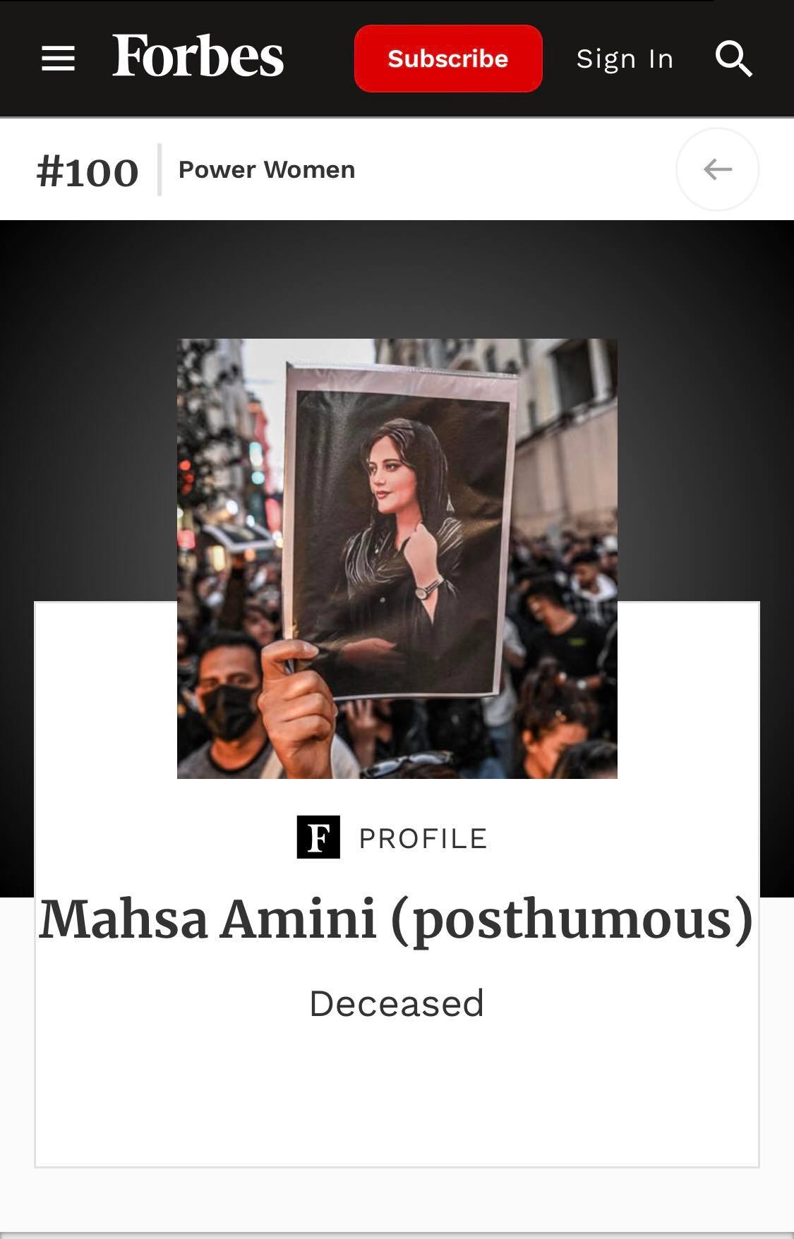 ئەو گۆڤارە لەسەر ژینا ئەمینی دەڵێت:" مەهسا ئەمینی یەکێکە لە بەهێزترین و کاریگەرترین ژن بۆ ساڵی ٢٠٢٢ وەک نوێنەری هەزاران ژن کە خۆپیشاندان ئەکەن لە ئێران لە پێناو مافە کانیاندا.