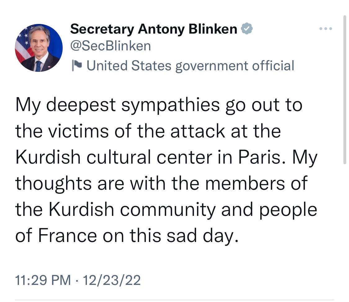 ئەم تویتەی وەزیری دەرەوەی ئەمەریکا لە کاتێکدایە رۆژی هەینی، 23-12-2022، پیاوێکی تەمەن ٦٩ساڵ لە ناوەندی شاری پاریسی پایتەختی فەرەنسا تەقەی لە ناوەندی کولتووریی ئەحمەد کایا و سەرتاشخانەیەک کرد و لە ئەنجامدا سێ هاونیشتمانی کوژران و سێ کەسی دیکەیش برینداربوون.