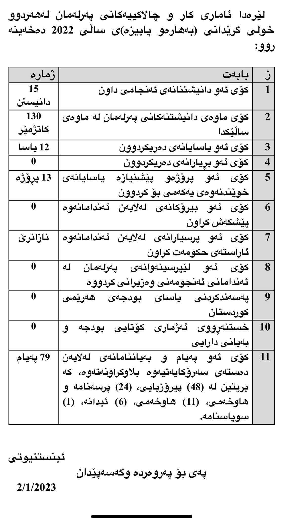 باسی لەوەشکردووە، بەم پێیە لەژێر رۆشنایی مادەی (51)ی پەیرەوی ناوخۆی پەرلەماندا دەبوو لە ماوەی ئەو خولی گرێدانەدا بەلای كەمەوە (50) دانیشتنی بكردایە، بەلام پەرلەمان كەمتەرخەم بوو و تەنها (15) دانیشتنی ئەنجامداوە.