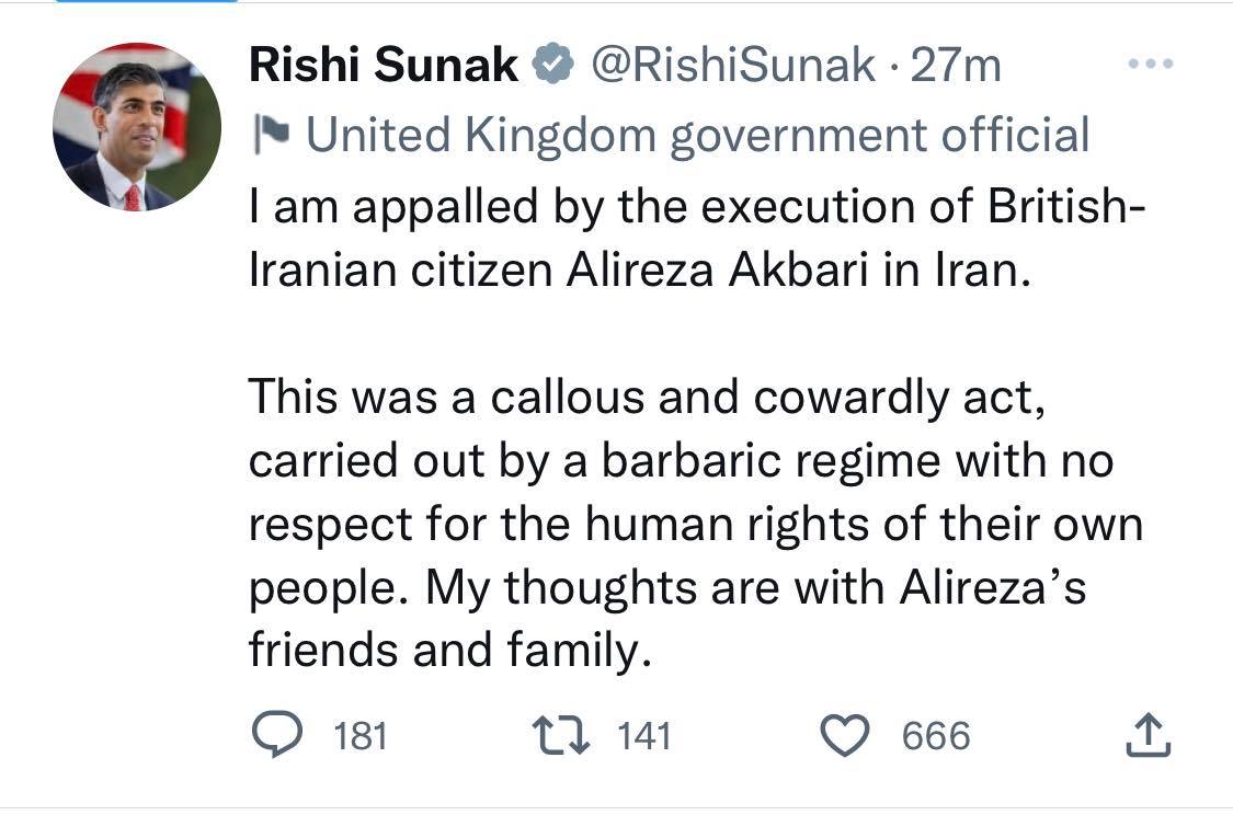 ڕیشی سوناک، سهرۆك وهزیرانی بەریتانیا له تویتێكدا له ههژماری تایبهتی خۆی له تۆڕی كۆمهڵایهتی تویتهر نوسیویهتی، "من بە لەسێدارەدانی عەلی رەزا ئەکبەری هاوڵاتی بریتانی- ئێرانی لە ئێران توشی شۆک بوم".