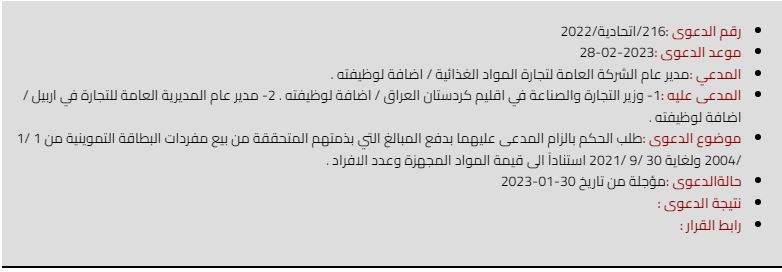 بەگوێرەی خشتەی دانیشتنەکانی دادگای فیدڕاڵی، بەڕێوەبەری گشتی کۆمپانیای گشتی بازرگانی بەشەخۆراک ، سکاڵای لەسەر وەزیری بازرگانی و پیشەسازی لە هەرێمی کوردستان تۆمارکردوە بابەتی سەرەکی سکاڵاکە، داواکاری بڕیاردرانە بۆ پابەندکردنی سکاڵالێکراو بە پێدانی بڕی ئەو پارەیەی لەبەرامبەر بەشە خۆراکی مانگانە لە رۆژی 1ی (کانونی دوەم/1)ی 2004ەوە تاوەکو 3ی (ئەیلول/9)ی 2021 لەهاوڵاتیان وەریگرتوە.