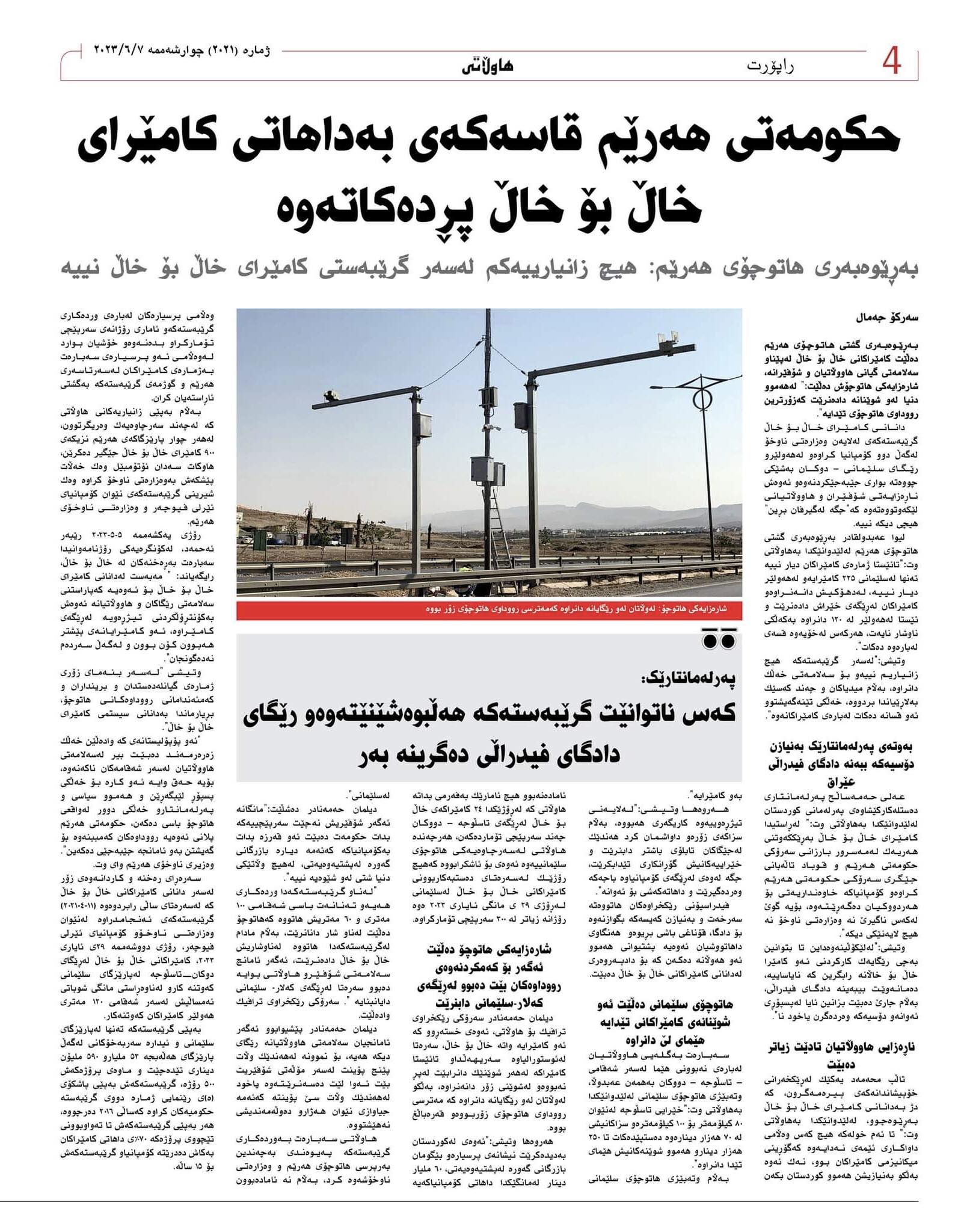 دانانی كامێرای خاڵ بۆ خاڵ گرێبەستەكەی لەلایەن وەزارەتی ناوخۆ لەگەڵ دوو كۆمپانیا كراوەو لەهەولێرو رێگای سلێمانی – دوكان بەشێكی چووەتە بواری جێبەجێكردنەوەو ئەوەش ناڕەزایەتی شۆفێران و هاووڵاتیانی لێكەوتووەتەوە كە»جگە لەگیرفان بڕین» هیچی دیكە نییە.