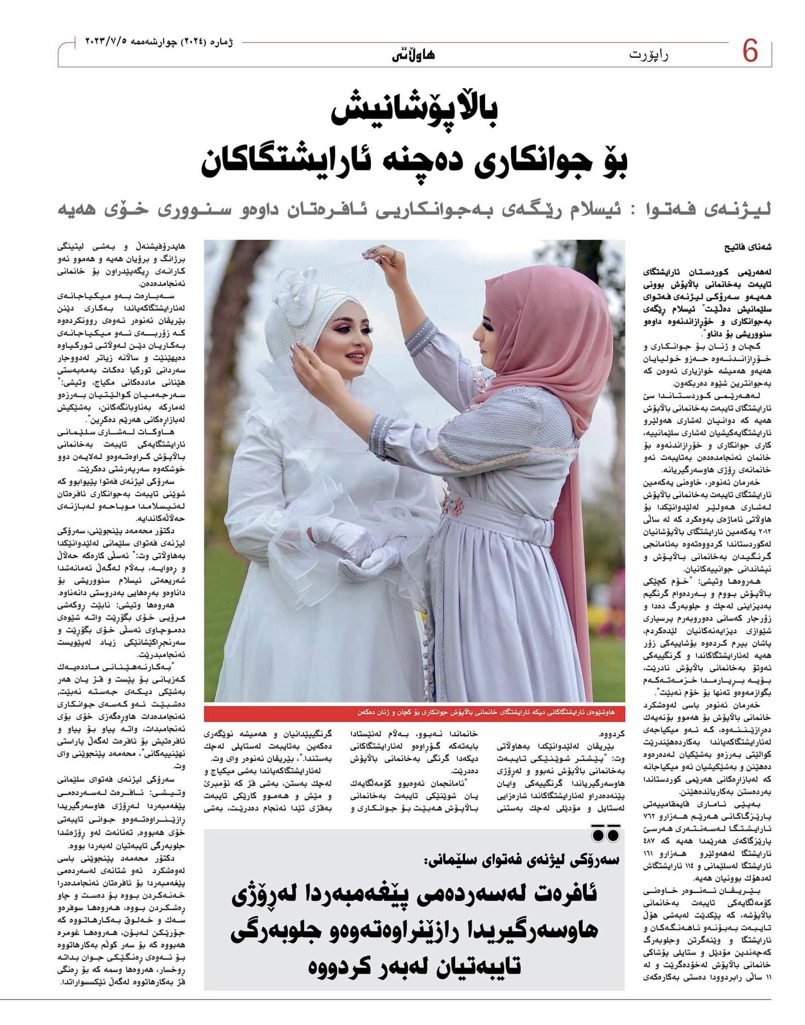 لەهەرێمی كوردستان ئارایشتگای تایبەت بەخانمانی باڵاپۆش بوونی هەیەو سەرۆكی لیژنەی فەتوای سلێمانیش دەڵێت» ئیسلام ڕێگەی بەجوانكاری و خۆڕازاندنەوە داوەو سنووریشی بۆ داناو».