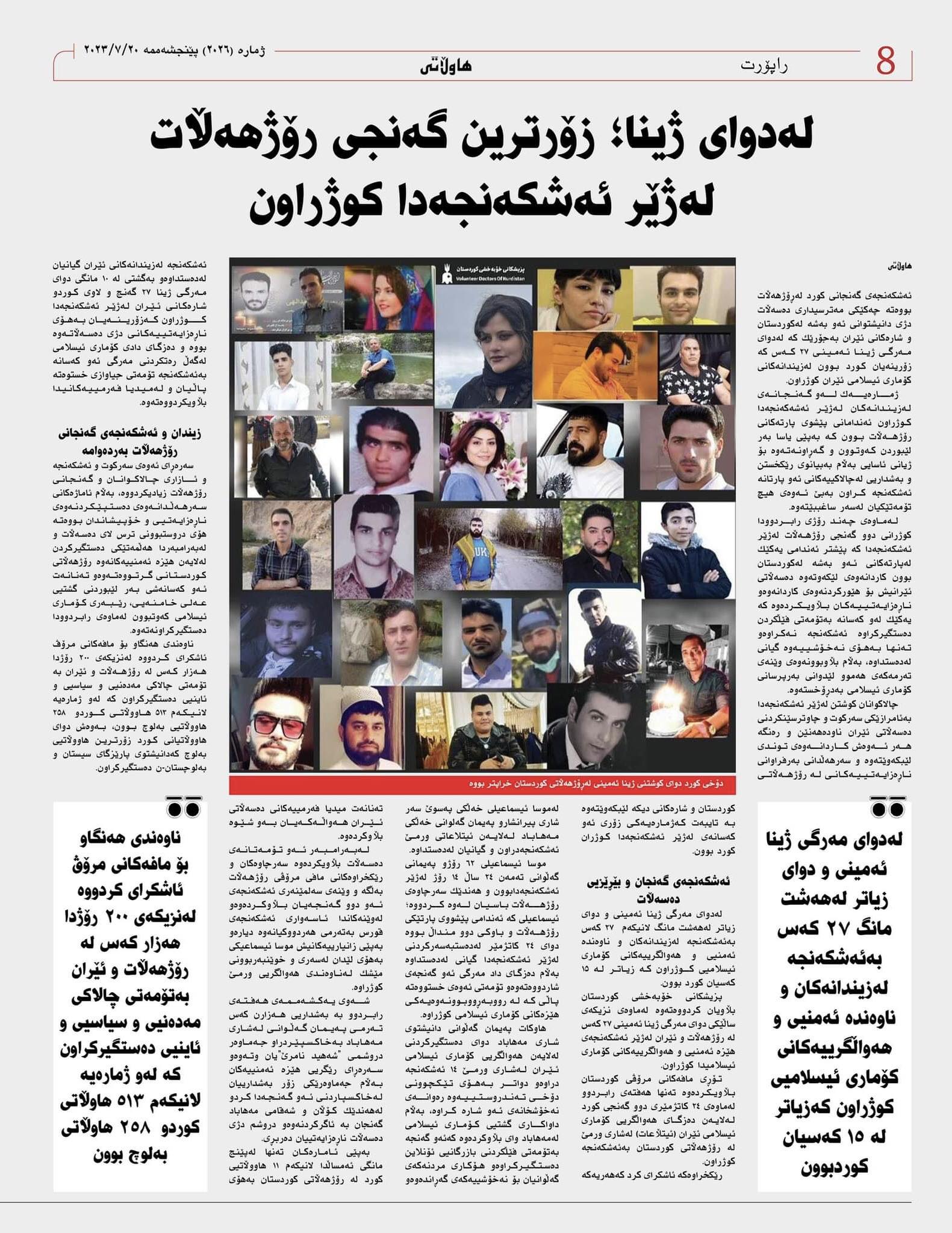 لە دوای مەرگی ژینا ئەمینی و دوای زیاتر لە هەشت مانگ 27 كەس بە ئەشكەنجە لە زیندانەكان و ناوەندە ئەمنیی و هەواڵگرییەكانی كۆماری ئیسلامیی كوژراون كە زیاتر لە 15 كەسیان كورد بون.