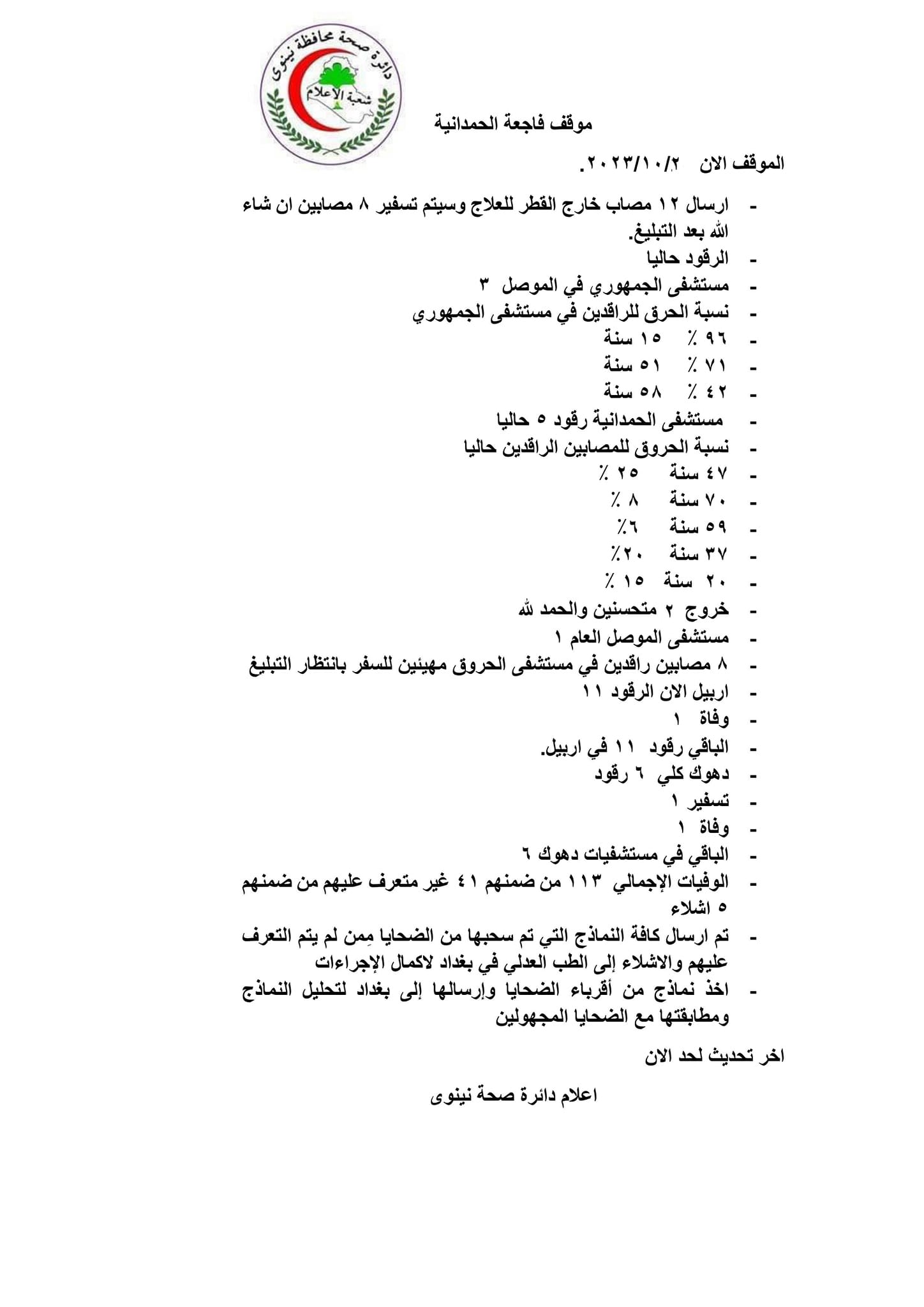 بهڕێوهبهرایهتی گشتی تهندروستی نهینهوا رایگهیاند، كۆی گشتی ئهو كهسانهی كه لهئهنجامی روداوی ئاگركهوتنهوهكهی قهزای حهمدانیه گیانیان لهدهستداوه گهیشتوهته 113 كهس و 41 كهسیان ناسنامهكانیان نهناسراوهتهوه.