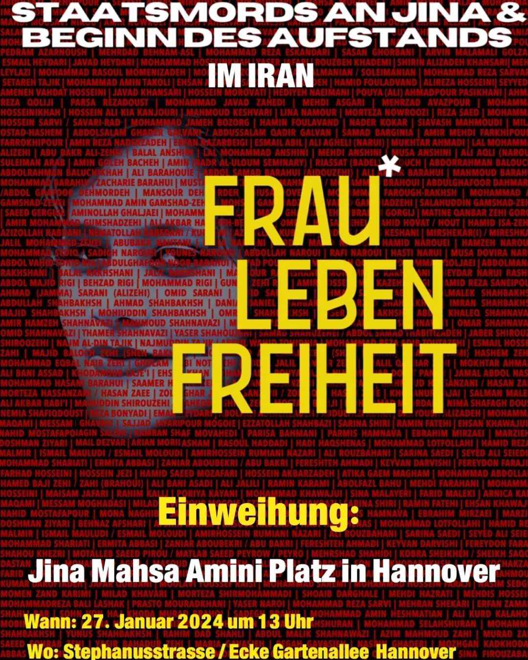 بە پێی ئەو زانیارییانەی دەست هاوڵاتی گەیشتوون: رۆژی شەممە ٢٧ کانوونی دووهەمی ٢٠٢٤، کاتژمێر ١ی دوا نیوەڕۆ رێورەسمێک لە شاری هانۆڤەری ئەڵمانیا بەڕێوە ئەچێت و ناوی یەکێک لە فولکەکانی ئەو شارە بە ناوی ژینا ئەمینیەوە ناودەنرێت.