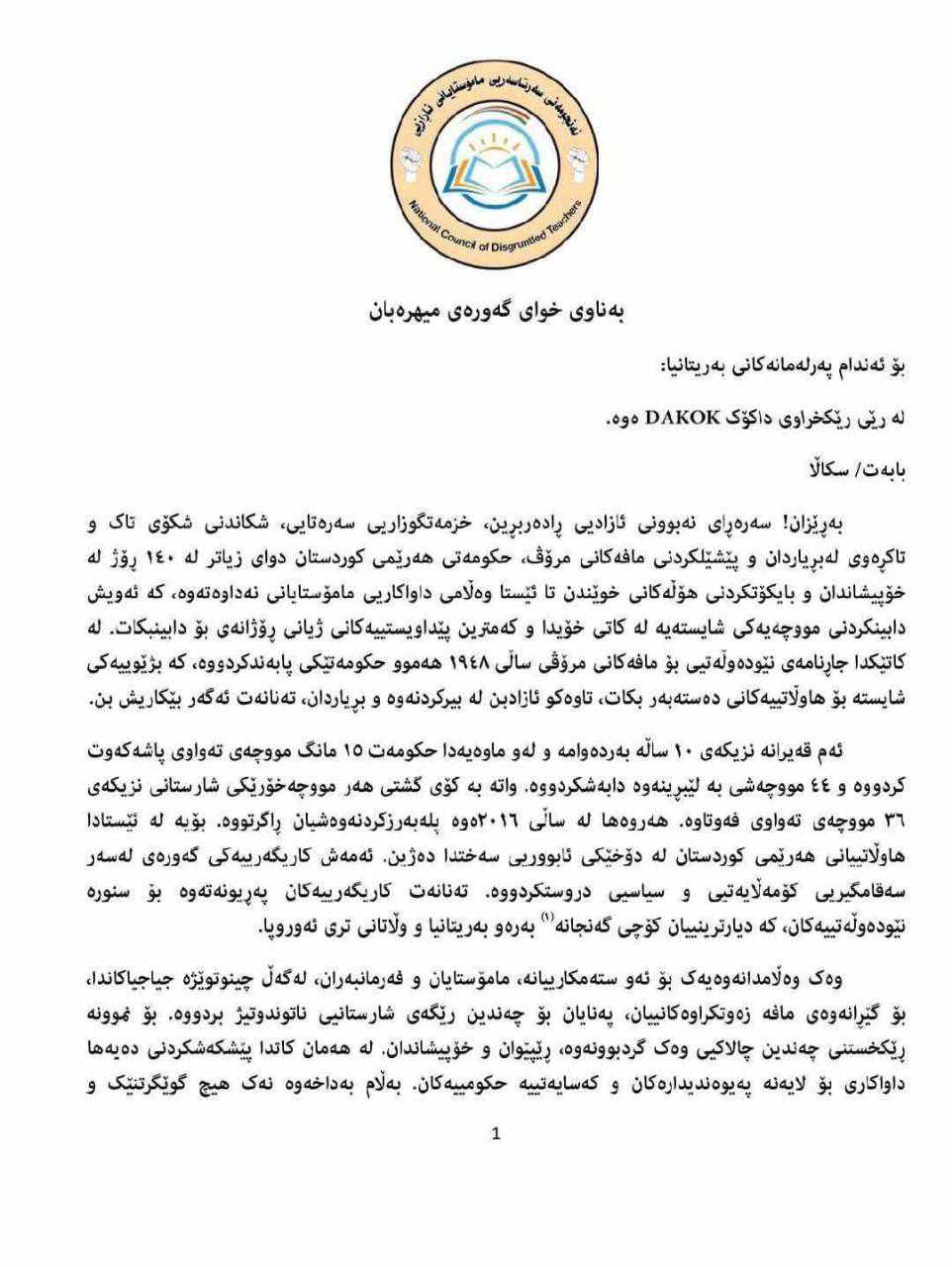 ئەنجومەنی سەرتاسەریی مامۆستایانی ناڕازیی، لەسەر دۆخی خراپی مووچەخۆرانی هەرێم و بایکۆت و ناڕەزایەتییەکان، بە یارمەتی ڕێکخراوی داکۆک سکاڵایەک ئاڕاستەی پەرلەمانی بەریتانیا دەکات.