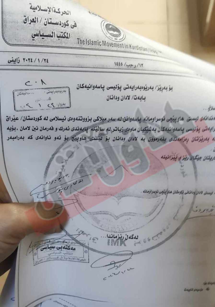 بە پێی سەرچاوەیەکی تایبەت لەناو بزوتنەوەی پەیوەندی ئیسلامیەوە وێنەی نوسراوێک بۆ هاوڵاتی نێردراوە کە تیایدا داواكراوە لادان و دانان بۆ چەند پاسەوانێكی بزوتنەوەی ئیسلامی بكرێت،بەهۆی ئەوەی لە لای كامیلی حاجی عەلی ماونەتەوە و نەگەڕاونەتەوە ناو ڕیزەكانی بزووتنەوەی ئیسلامی.